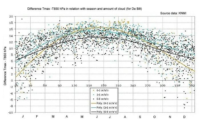 en die zegt bij onbewolkt weer 16°, bij halfbewolkt 15°. Maar deze data geldt voor De Bilt.