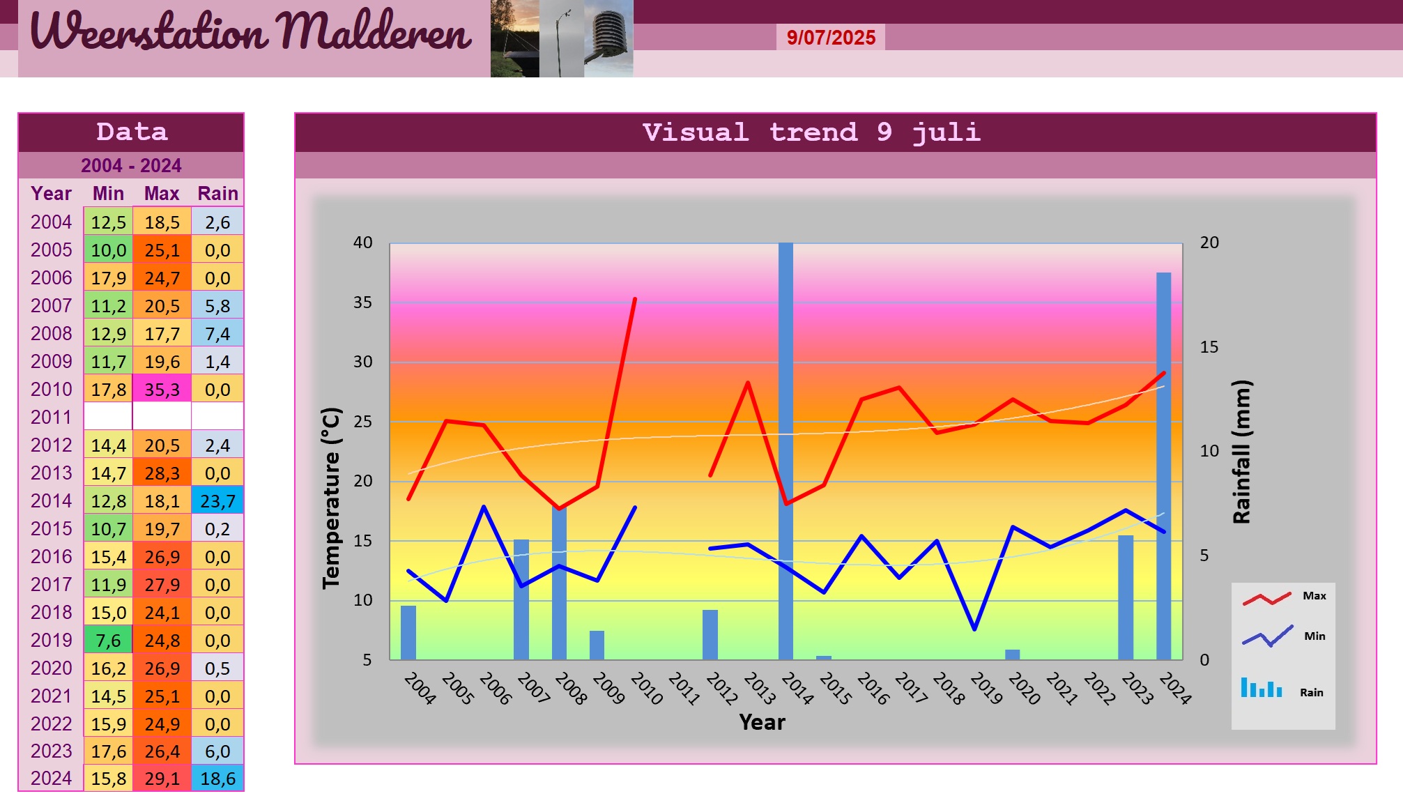 Restanten van Franse onweersbuien zorgden vanochtend voor een half bewolkt weertype dat we bij erg warme minima van 17,8 graden konden ervaren. De bewolking bestond vooral uit Altocumulus castellanus, Stratocumulus en Cirrus terwijl er onder de dikste wolkenpartijen valstrepen zichtbaar waren. Aangezien deze tot aan de grond reikten, is het wellicht op sommige plaatsen reeds tot lichte regenbuitjes gekomen al was er van onweer nog geen sprake. Ondanks de bewolking warmde het zeer snel op en werd er op verschillende plaatsen tegen de middag reeds 33 graden of meer opgetekend. De opwarming zette zich door onder de wisselend bewolkte hemel en resulteerde te Malderen uiteindelijk in een zinderende 35,3 graden. Veel verkoeling kon de west- zuidwesten wind met haar snelheden tot 25,7 km/h in deze omstandigheden niet bieden. De eerdergenoemde wolkentypen verdwenen grotendeels tijdens de namiddag om plaats te maken voor een aantal flinke stapelwolken, maar deze zakten na verloop van tijd weer in elkaar. Dit leidde ons naar een lichtbewolkte tot heldere maar nog steeds zeer zwoele avond waarin het slechts heel langzaam afkoelde. De droogte bleef met een neerslagtotaal van 0,0 mm standhouden, maar daar zou morgen wel eens verandering in kunnen komen...