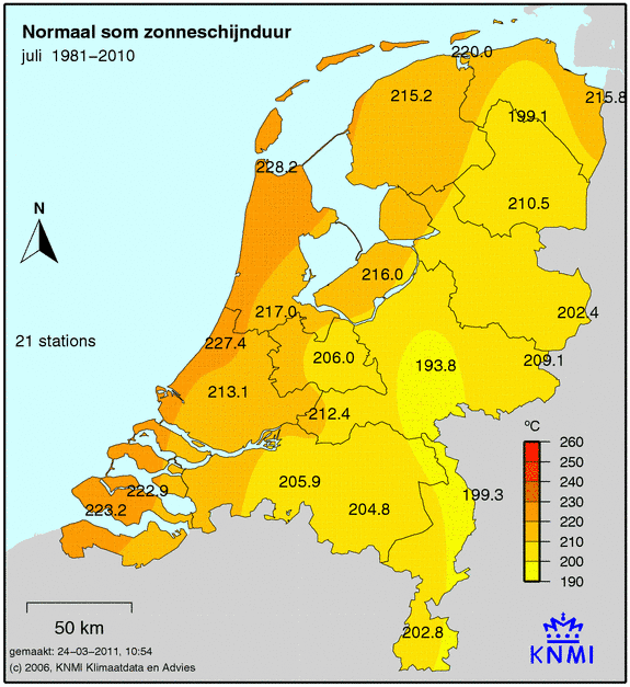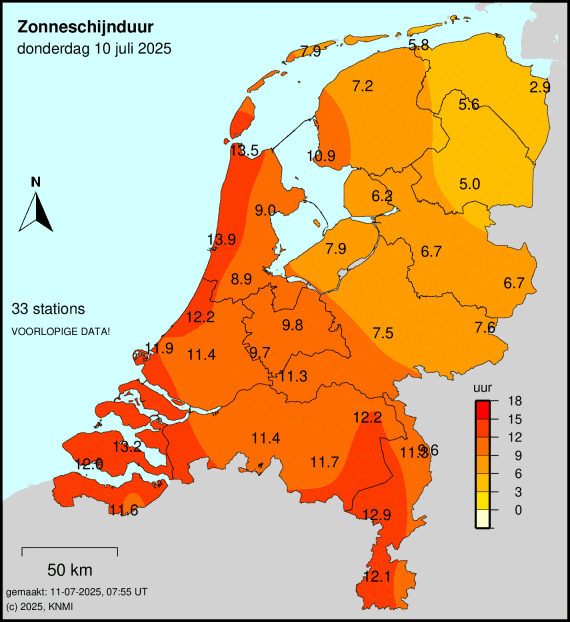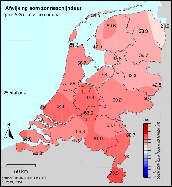 Normaal is het 25-30 zonuren verschil. Juni 2025 kom je op 65uren verschil tussen noord-oost en west