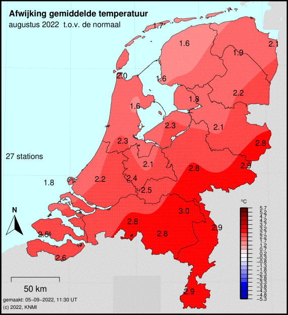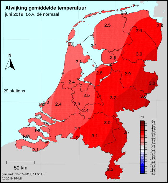 Zie de temperatuuranomalieën van het maandgemiddelde in elke zomermaand. In juni 2019 en augustus 2022 ook redelijk, hoewel in 2019 lag de de nadruk meer op het oosten.