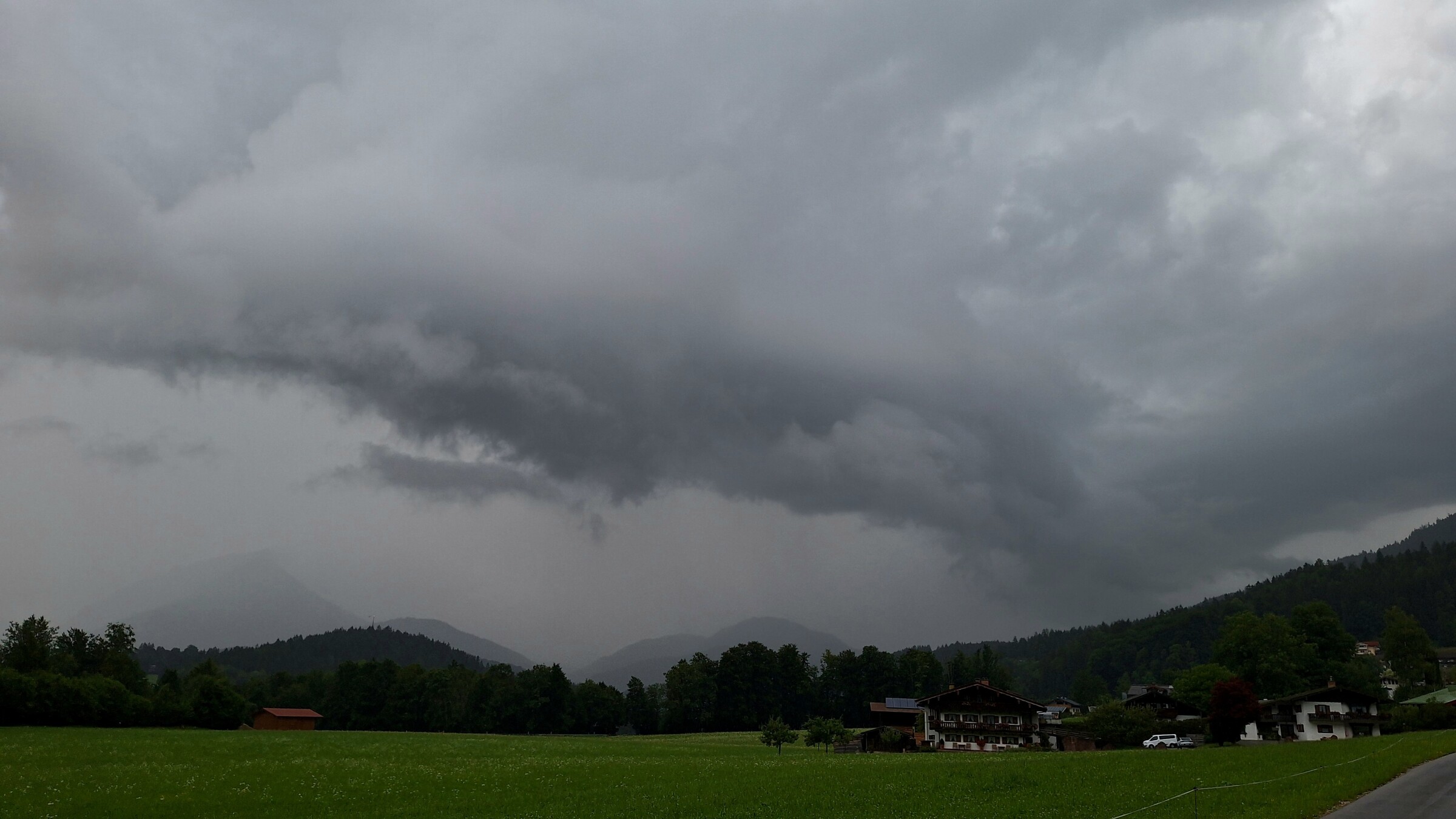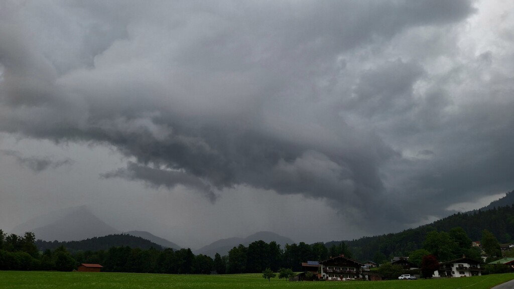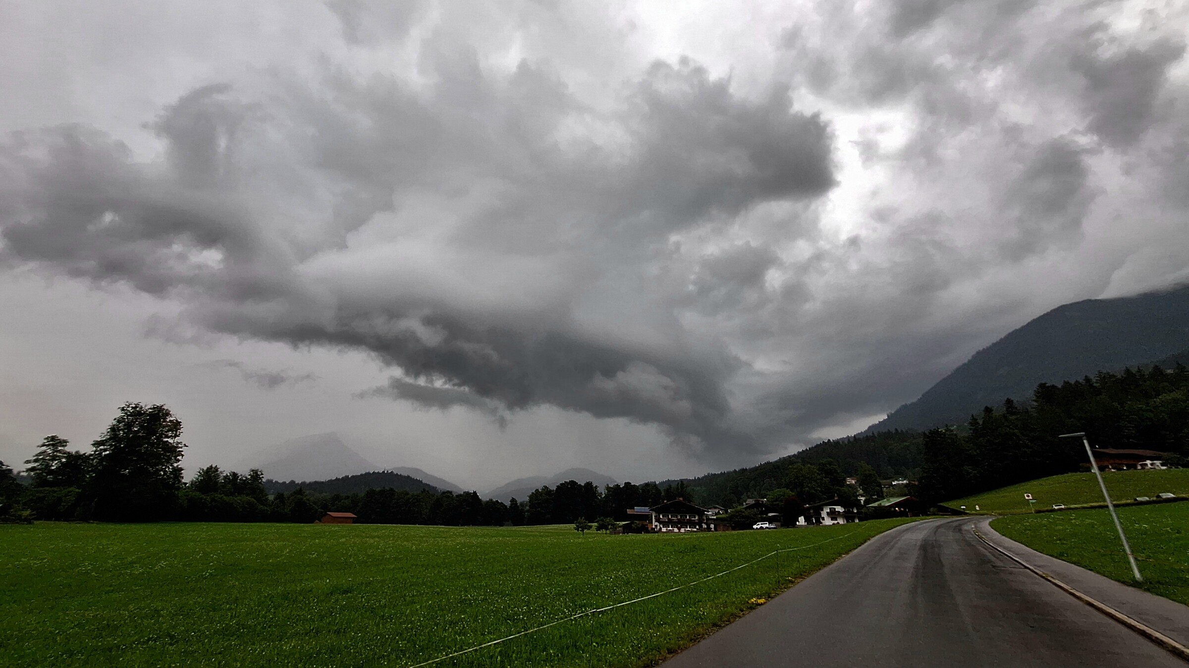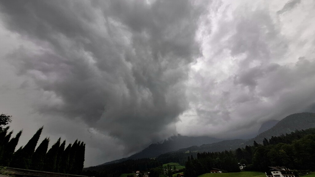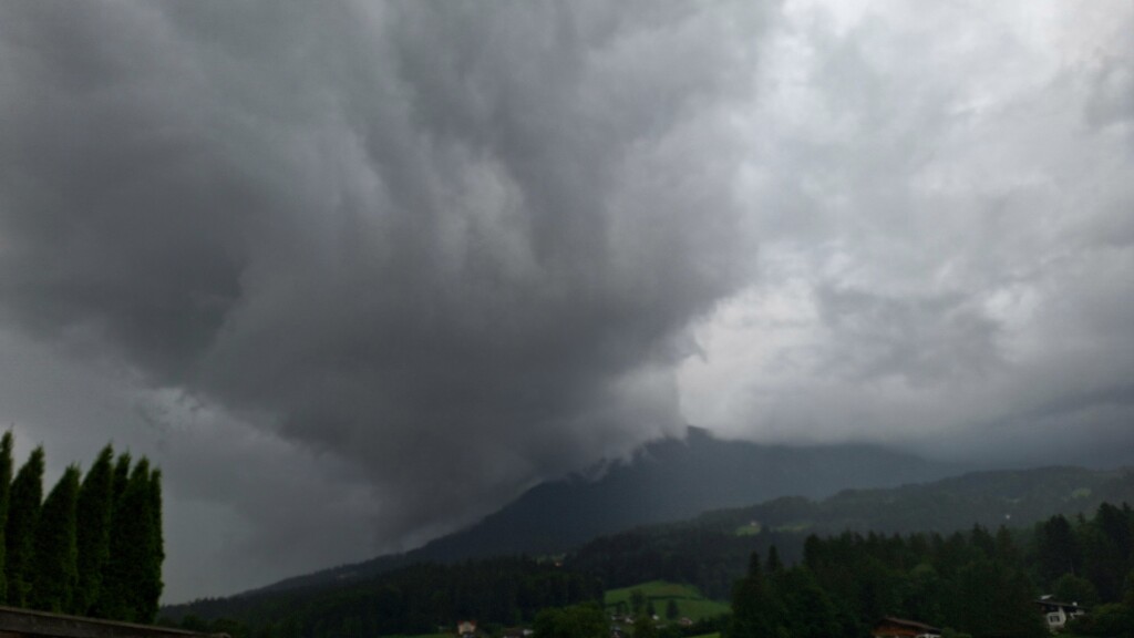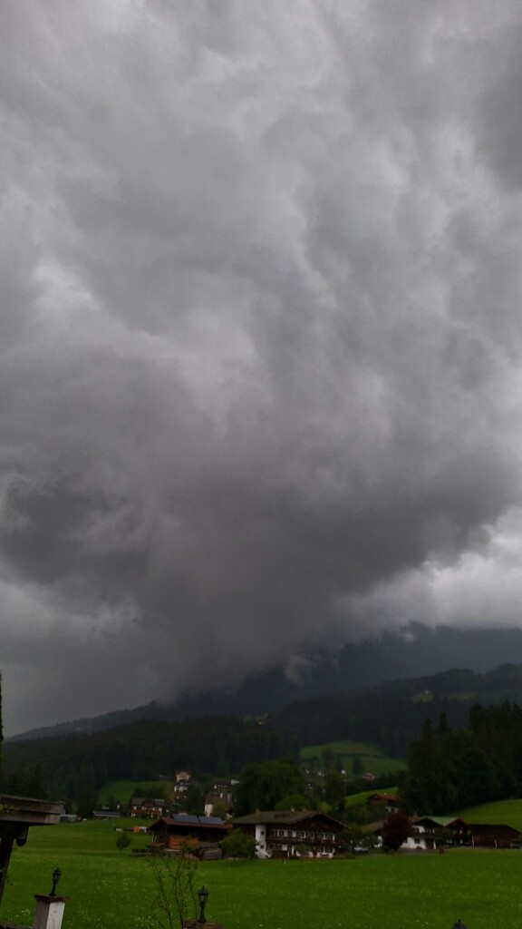 Terwijl het in de lage landen momenteel aardig weer is, is het hier in de Alpen maar koel en wisselvallig. Vanmorgen rond 10u een knetterende onweersbui , vanmiddag best aangenaam weer met wat zon maar vanaf 20.30 trok er weer een forse bui met onweer over en daaraan voorafgaand een Arcus. (Rolwolk)