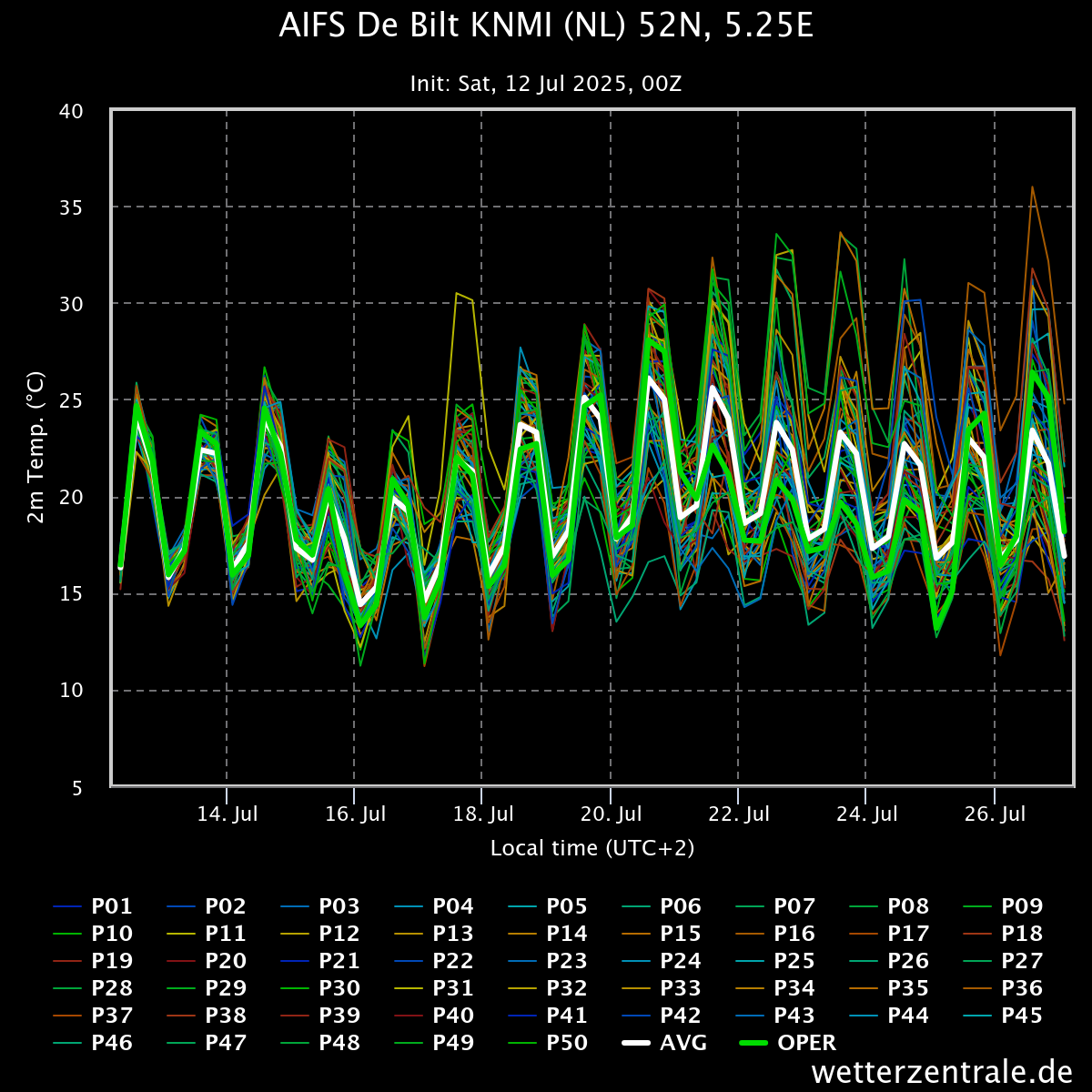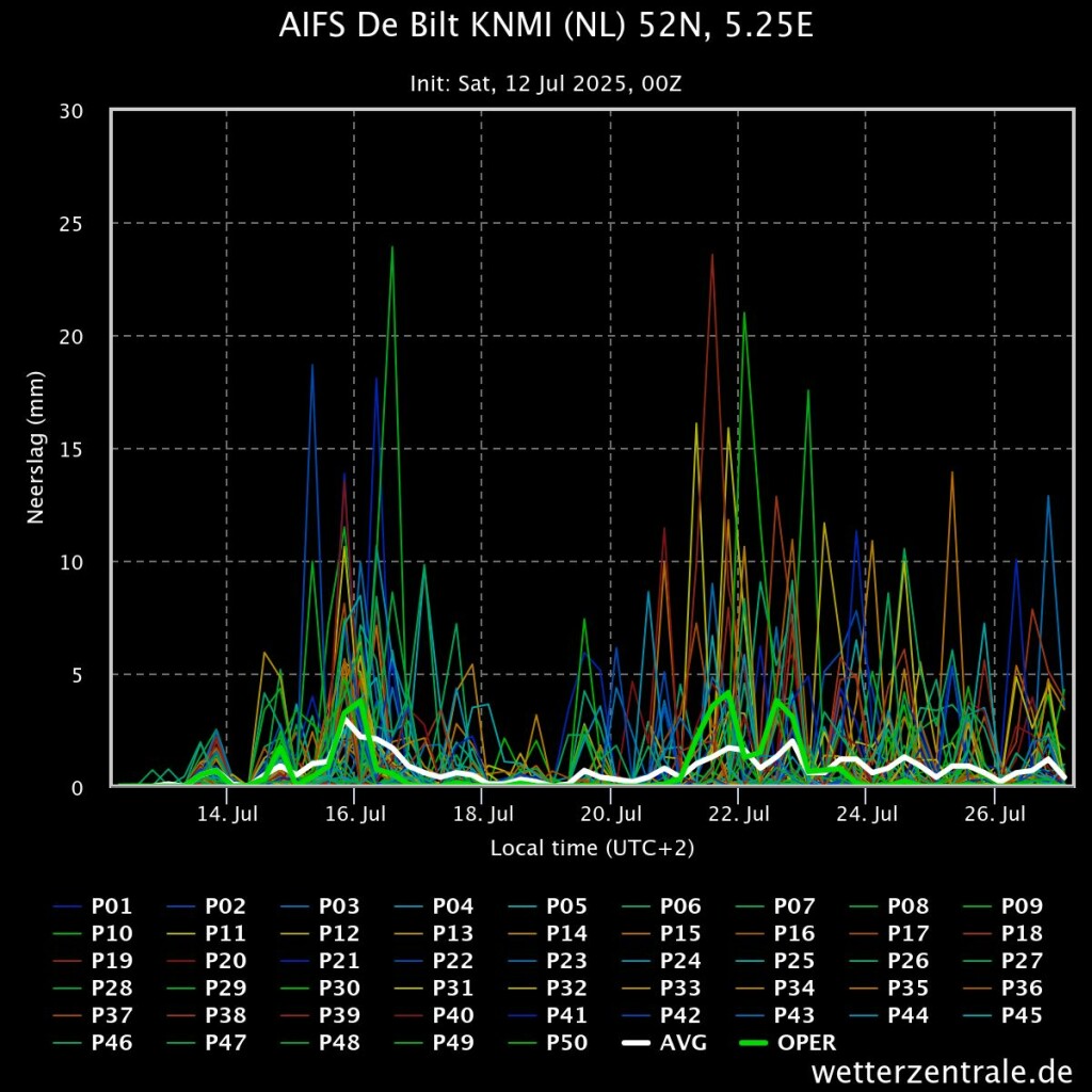 De piek in temperatuur die we in ECMWF en GFS zien rond 20/21 juli begint zich ook bij AIFS af te tekenen, al is dit model nog wel wat gematigder. Neerslag lijkt t.o.v. voorgaande runs wat afgenomen met nu eerder 2 pieken i.p.v. doorlopend hogere waarden vanaf komende week.