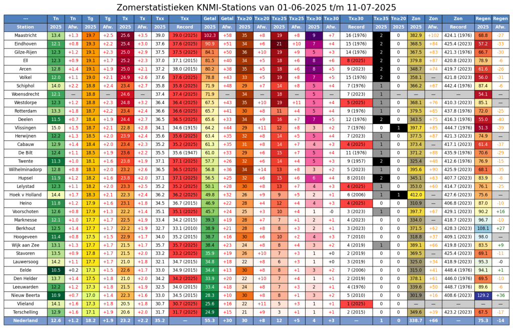 Hieronder de zomerstatistieken voor alle KNMI-stations van 1 juni t/m 11 juli.