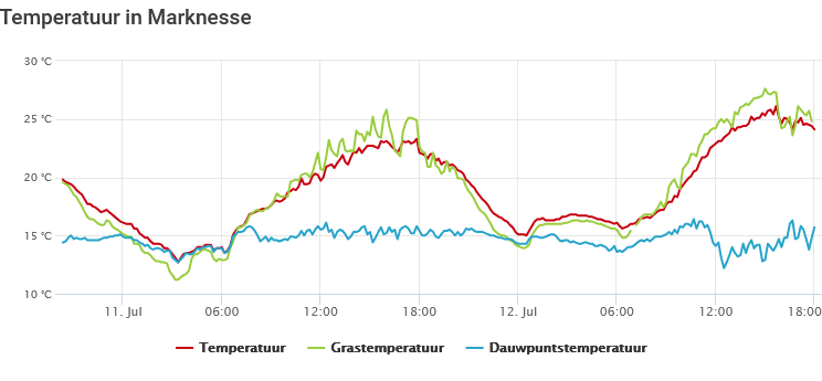 De zonuren van Marknesse zijn waarschijnlijk ergens blijven steken. Het interpolatieprogramma doet dan de rest. Maar ik heb even gekeken naar de registraties van dat station. Wordt daar ook beregend, met een periode van ongeveer een uur? Dat zie je met name aan de grastemperaturen van gisteren. Vandaag ook een forse dip.