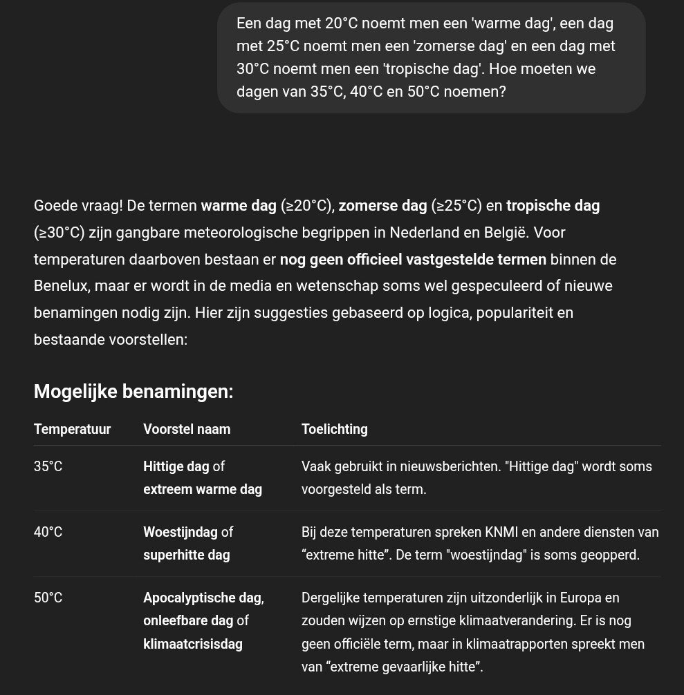 We kennen allemaal de officiële termen voor dagen met een maximumtemperatuur van boven de 20°C, 25°C en 30°C. Nu extreme hitte steeds vaker voorkomt, kunnen er wellicht meer termen verzonnen worden. Ik heb het aan ChatGPT gevraagd en het volgende kwam eruit.
