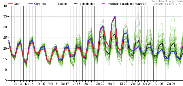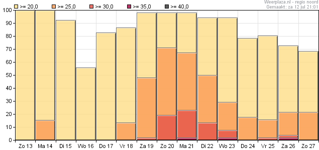 Zuidelijke helft Benelux toenemende kans regionale hittegolf.