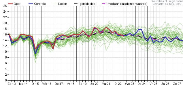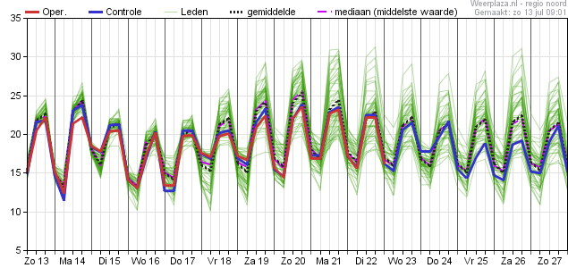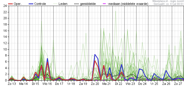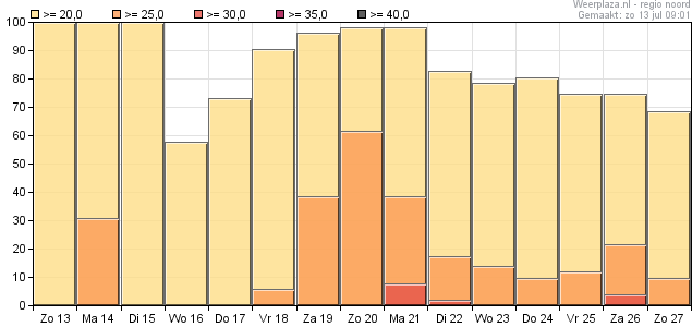 Temp tussen 25 en 30, neerslag signalen bij hoog dauwpunt