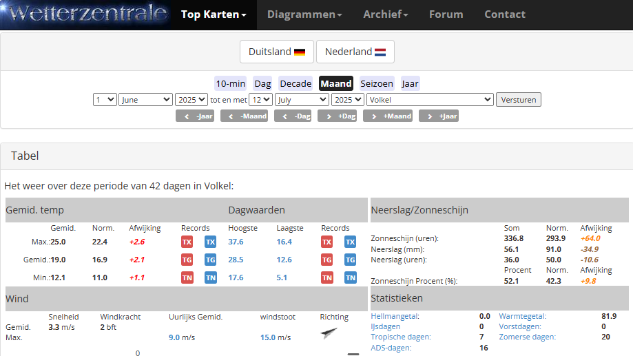 Qua aantal zomerse dagen vrijwel gelijk, gemiddelde maximumtemperatuur in 2025 wat hoger dan in 2018 voor de eerste zomerhelft. Het aantal ADS-dagen (above average, dry and sunny) lag in 2018 wel hoger. Aantal zonuren vrijwel exact gelijk en duidelijk droger in 2018 vergeleken met nu. Het aantal zonuren in deze zomer voor Volkel bedraagt 343,0 uren (inclusief 11 juli, op WZ nog niet bijgewerkt).