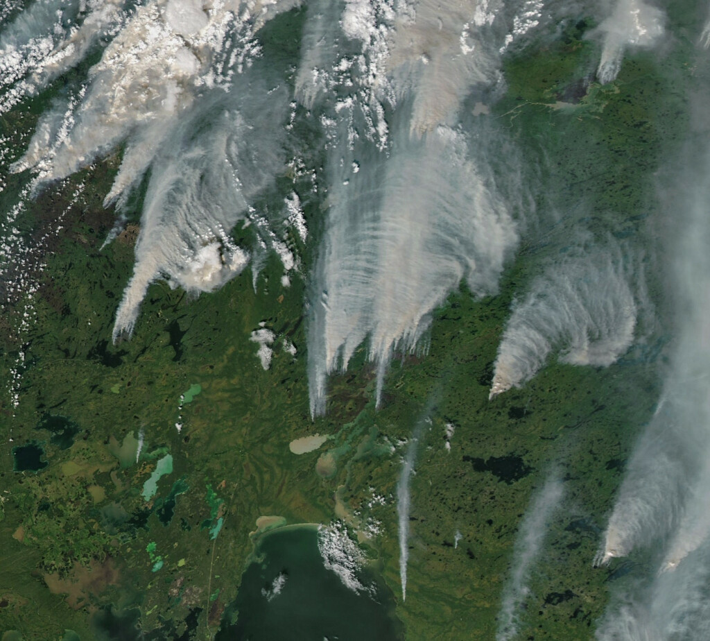 Volgens de NASA is er in Canada alleen in 2025 4,8 miljoen hectare, een oppervlakte groter dan Nederland, in vlammen opgegaan. Als de wind een beetje goed zit hangt dit straks ook weer boven onze hoofden. Beeld van 9 juli:
