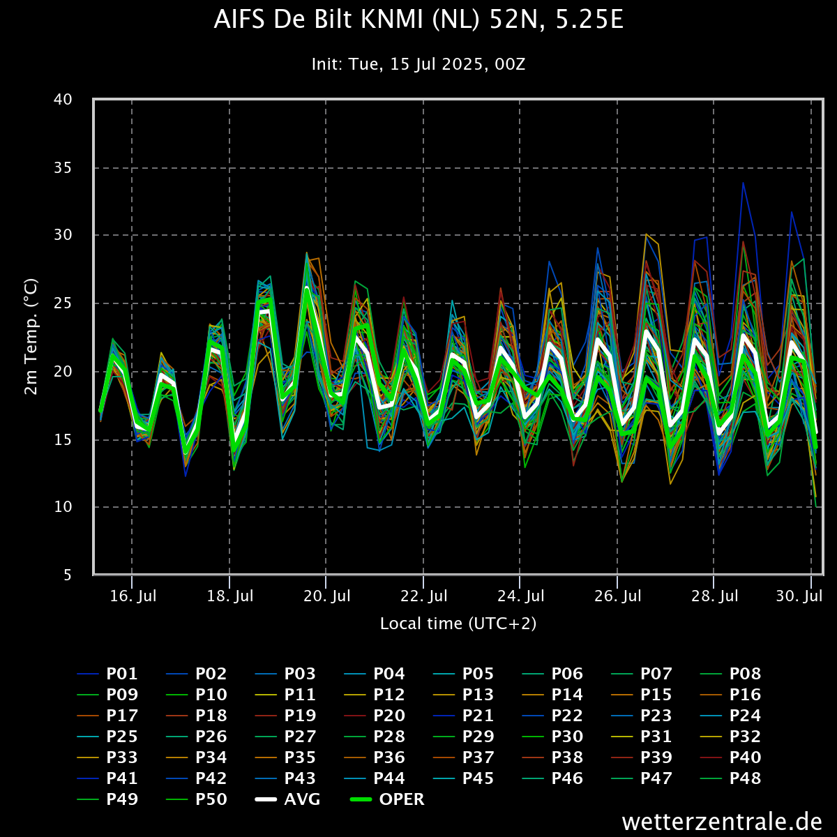 Een piekje komend weekeinde en daarna toch vrij gematigd, al ligt de operationele run dan wel vooral onder het gemiddelde en is er net zoveel spreiding naar >25°C als <20°C. Het merendeel van de leden ligt echter tussen de 20°C en 25°C. Gezien de kaarten hebben we vooral met westenwind te maken op de lange termijn.