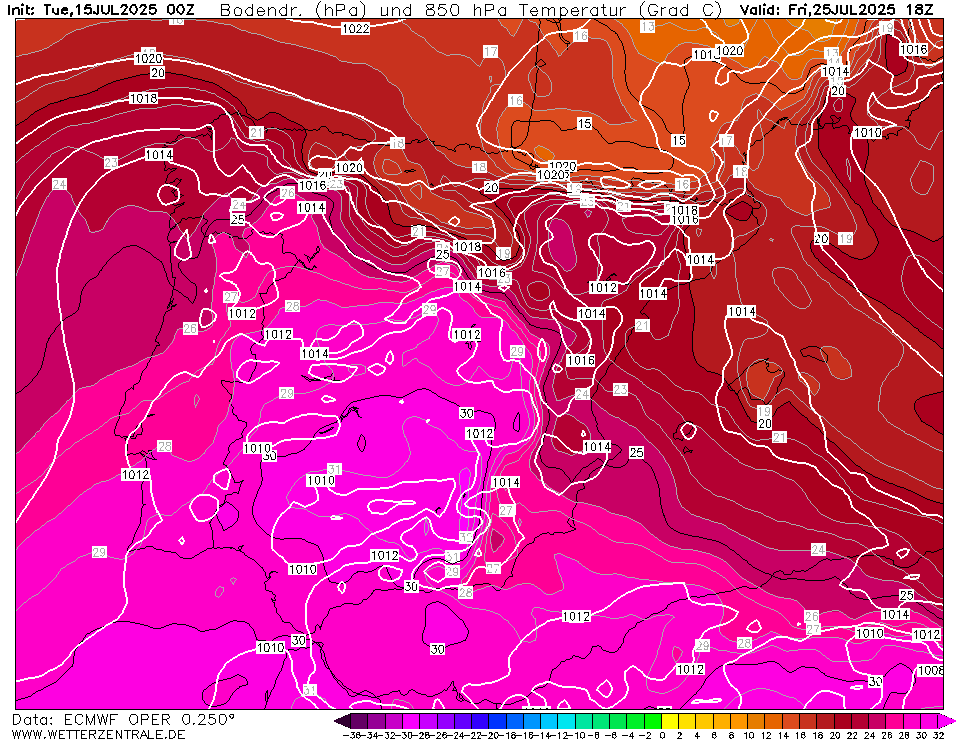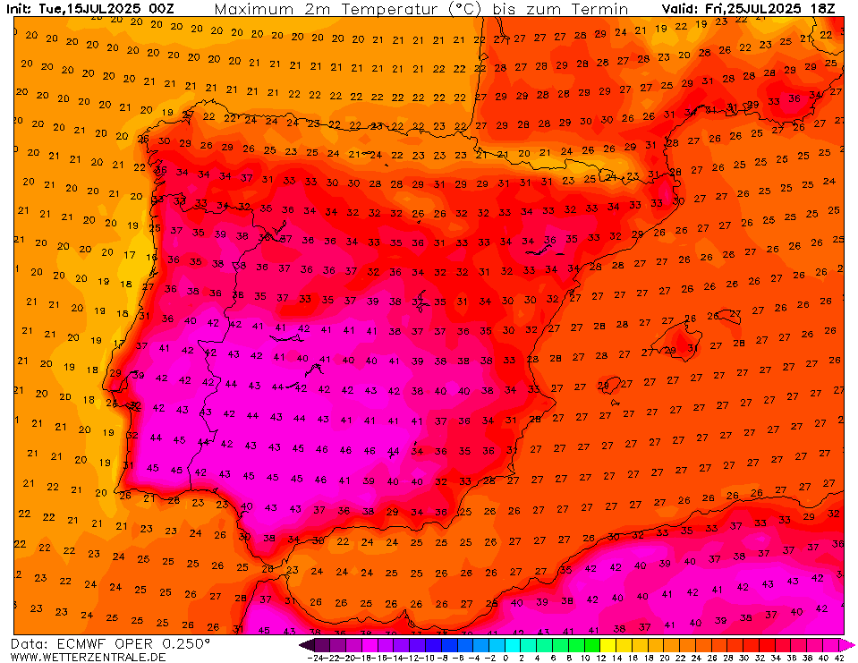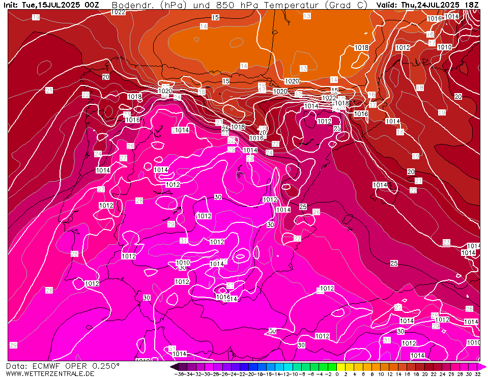 Er begint zich een nieuw hittebastion te vormen in de modellen op ongeveer 9-10 dagen vooruit, boven het Iberisch Schiereiland wel te verstaan. Voor mij enigszins spannend, want ik land op 24 juli om 09:40 uur in Sevilla. Dus de dag van aankomst zou direct wel eens extreem kunnen worden. De dagen daarna aanhoudend.