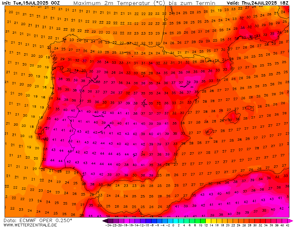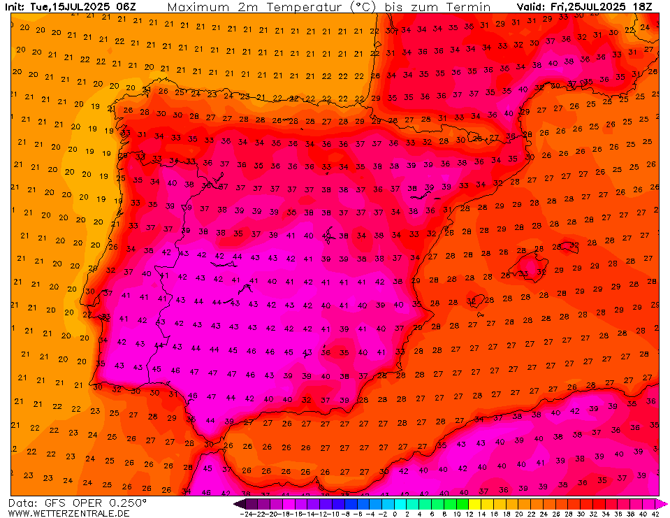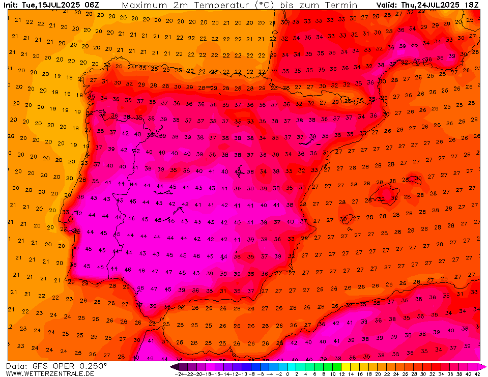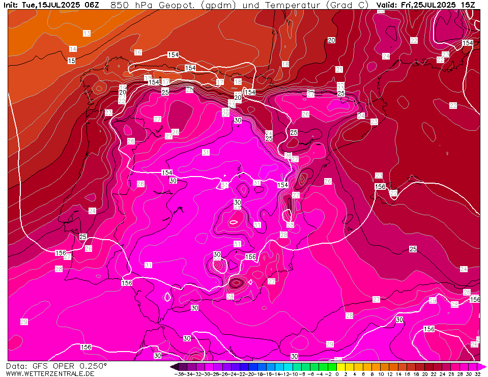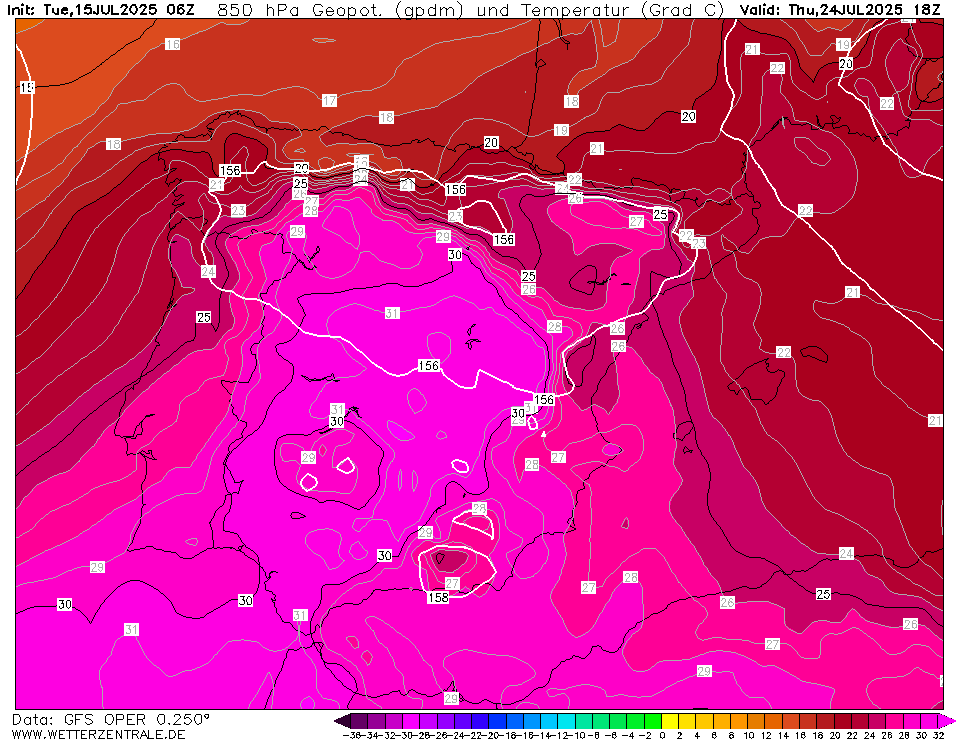 Dieproze T850 tot boven de 30C en temperaturen oplopend tot 44-45C of zelfs 47C waar GFS mee komt. Dat belooft wat te gaan worden mits dit in de modellen blijft zitten.