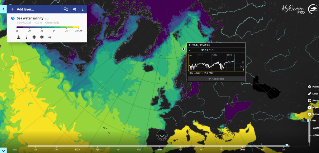 Dank Peter! Het eerste wat mij hier al opvalt is dat hier geen sprake is van een afnemende saliniteit in de eerdergenoemde gebieden. Terwijl die wel duidelijk zichtbaar is bij https://salinity.oceansciences.org/smap-salinity.htm. Waar aan zou dat liggen? Gebruiken ze een ander model? Mijn kennis is hier niet bepaald uitgebreid dus ik begrijp de verschillen niet zo goed.