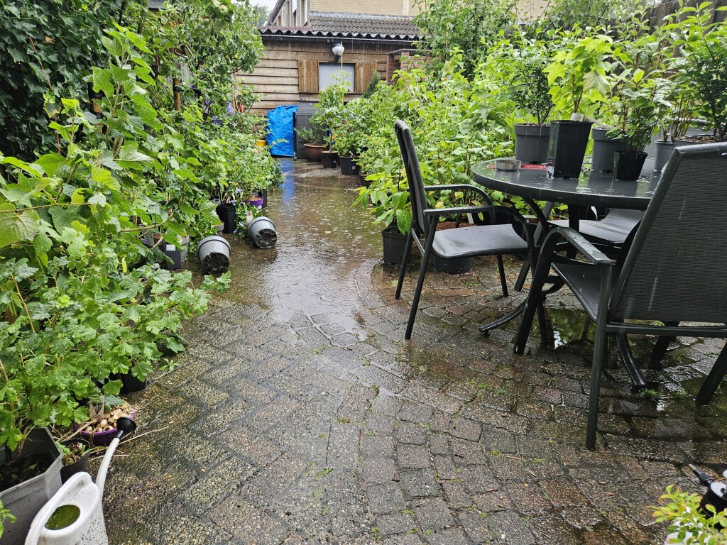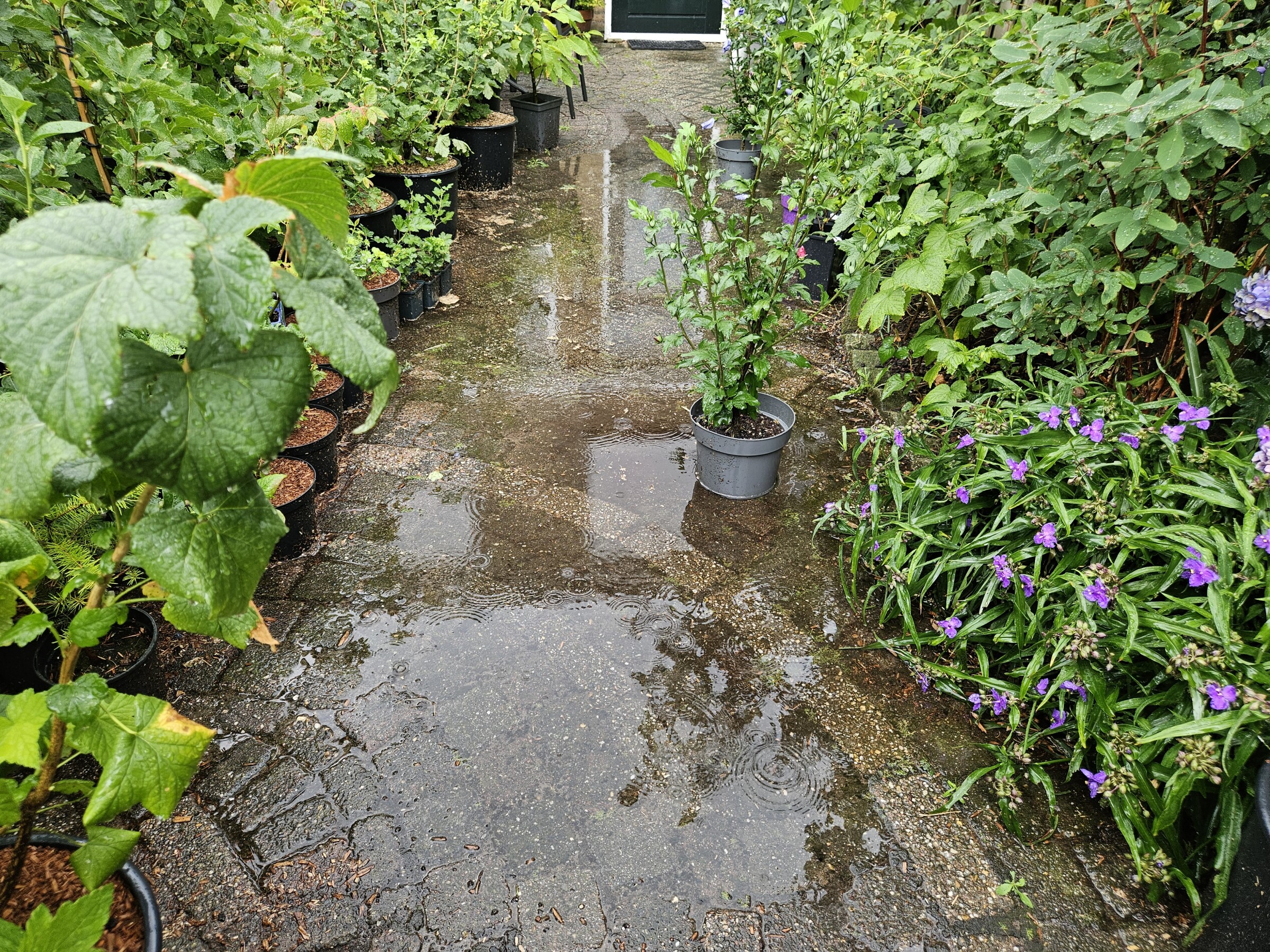 Een voordeel, kan de hibiscus voor mijn broertje gratis in leven houden met een spontaan ontstaan meertje. Die waren omgewaaid en hadden geen regen in de pot ontvangen.