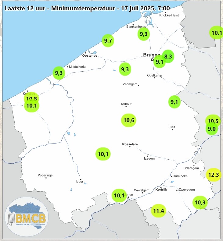 Kaart met minima en de typisch nog koudere hoek oost van Brugge. Dat hoekje naar het meetjesland kan zelfs erg fris uitpakken op zomerse dagen waar het hier niet onder 15°C geraakt daar dan vlot naar 11/12°C. Vaak daar dan geheel windstil en hier een luchtlagen verstorende bries van over de oostelijke heuvelruggen.