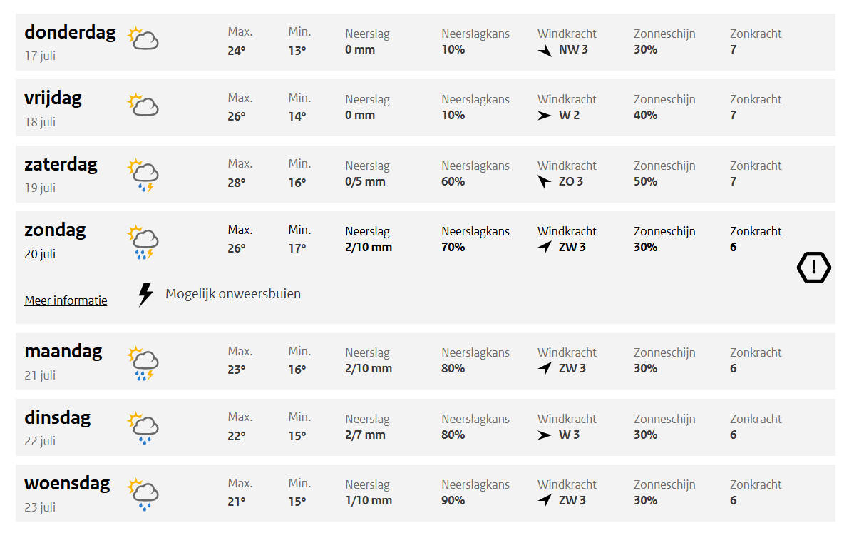 "In de middag en avond kans op onweersbuien. Hierdoor kan plaatselijk hinder/overlast ontstaan voor verkeer en buitenactiviteiten"