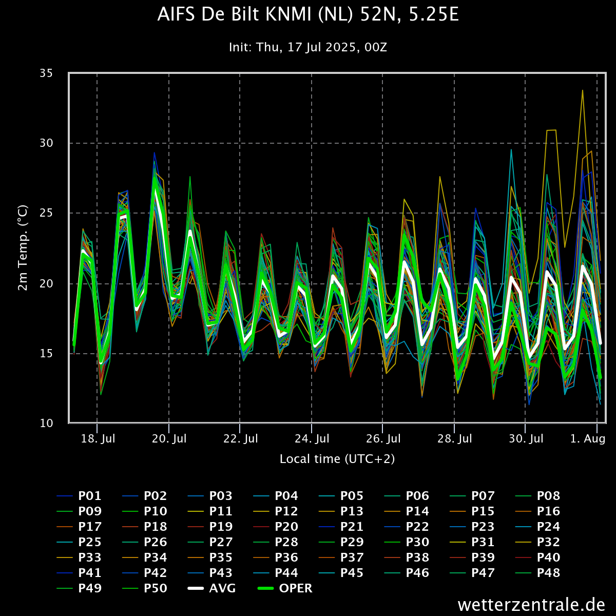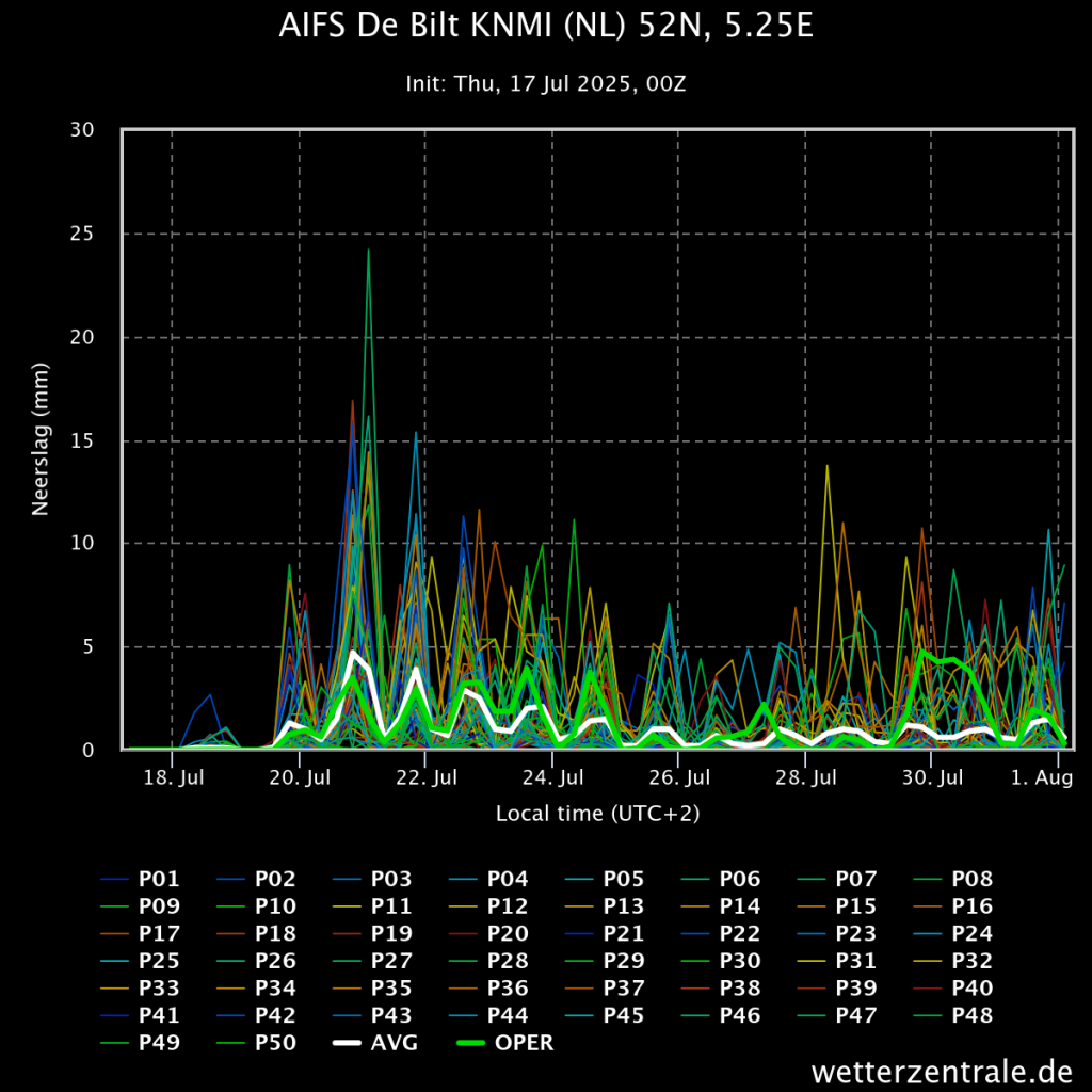 De operationele run is met de berekende noordelijke aanvoer op het einde één van de meest frisse leden, desondanks wordt wel duidelijk dat ten opzichte van vorige ensembles de hoeveelheid leden met minimaal zomerse temperaturen afneemt. Het ensemble evolueert dan ook naar gematigd zomerweer met regelmatig ook kans op wat neerslag.