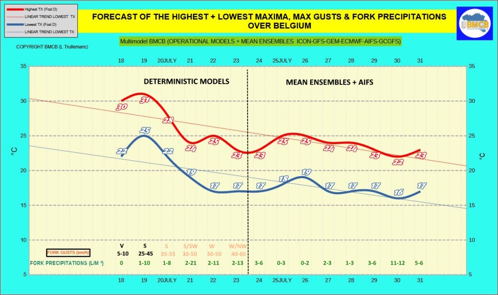| Donderdag 31 | 17/23 | 5–6 L/m² | Geregelde buien of regen |