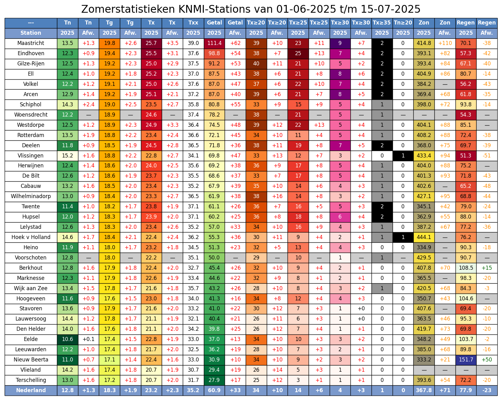 Weerstatistieken eerste zomerhelft 2025 voor alle KNMI-stations.