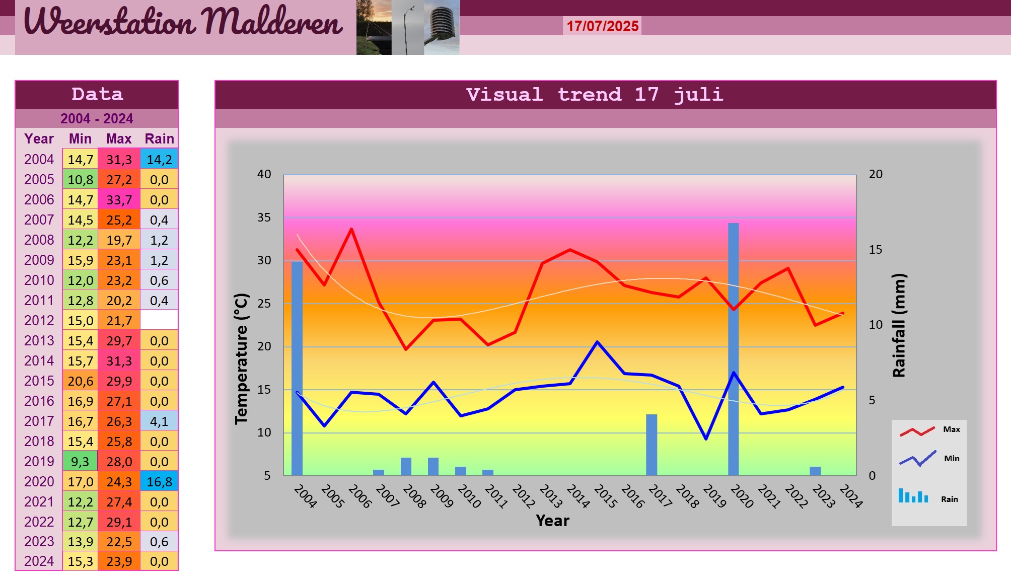 Voor het eerst sinds heel lang geleden mochten we te Malderen kennismaken met wat men een "flink onweer" noemt. Bij het krieken van de dag zag het er al heel onstabiel uit terwijl de temperaturen snel de hoogte in gingen, beginnend bij 14,7°C en uiteindelijk eindigend op een tropische 31,3°C. De lucht was zwanger van het vocht en dat was te zien aan de dauwpunten die uitstegen tot 20°C. Om 17H30 was het hier dan prijs met een eerste onweer dat werd voorafgegaan door dikke druppels, en nadien felle rukwinden die opliepen tot 49,9° km/h. Vervolgens kwam er een flinke geut regen naar beneden, waarbij de intensiteit opliep tot 115,2 mm/h, en er zaten zelfs wat hagelsteentjes tussen gemengd. Ook opvallend was de bijzonder sterke stijgstroom aan de voorzijde van de bui die de wolken als in een versnelde film omhoog werden gezogen. We kregen nadien een vijftal minuutjes rust, waarna een tweede onweer opnieuw de hemelsluizen volledig openzette en de neerslagintensiteit nog eens opliep tot 108,6 mm/h. Dit bracht het totaal uiteindelijk op een erg hoge 14,2 mm. De bliksemintensiteit was ook erg hoog, maar de meeste ontladingen waren veraf en resulteerden in een eerder voortdurend gerommel. Voorlopig hebben we het wel gehad maar of het vanavond droog blijft is even afwachten want op de radar zijn er nog wat buitjes te zien die vanuit Frankrijk komen opstomen. Morgen zou er ook nog flink wat onweer inzitten, en dat blijft ook voor de eerste helft van de nieuwe werkweek zo.