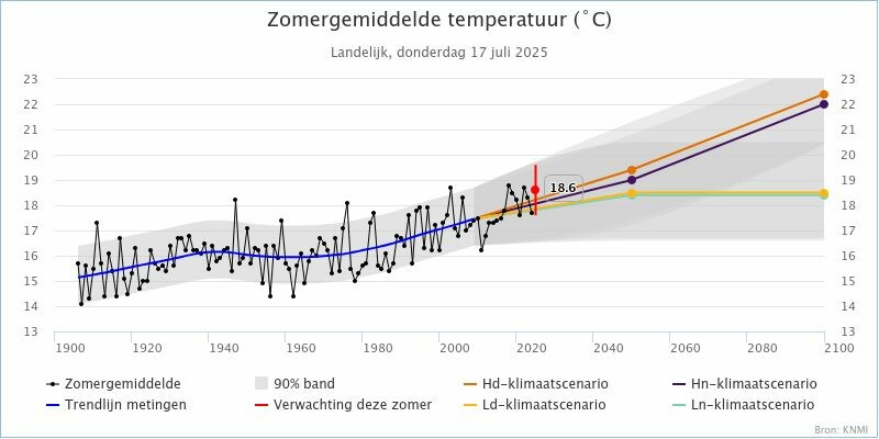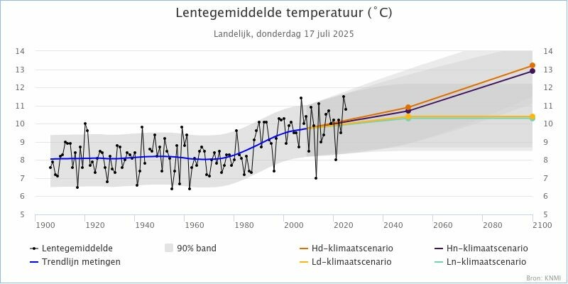 In deze grafiek van het KNMI klimaatdashboard kun je dat eigenlijk heel mooi zien. Dat de uitschieters naar beneden in de zomer geheel niet meer voorkomen. In het seizoen met dezelfde daglengten, maar dan tegengesteld heb je dat duidelijk nog wel.