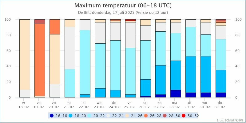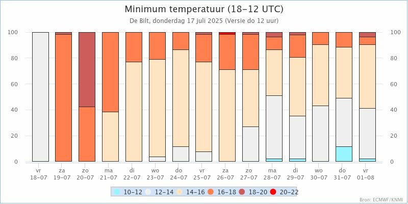 Voor de maximumtemperatuur na het weekend aan de koele kant van de normaal. Voor de minimumtemperatuur juist aan de warme/zachte kant.