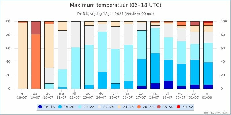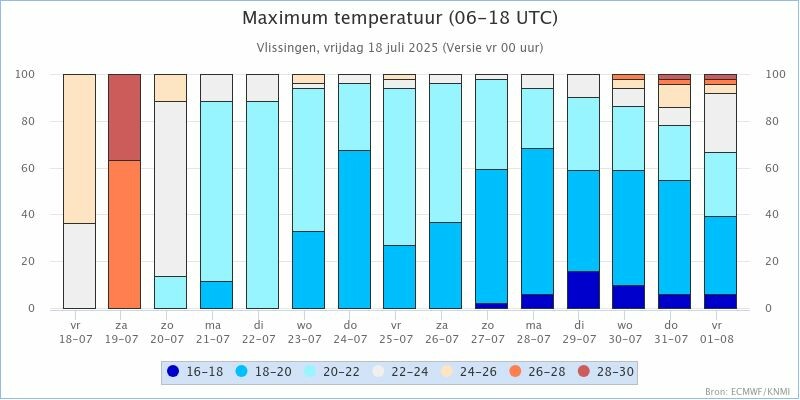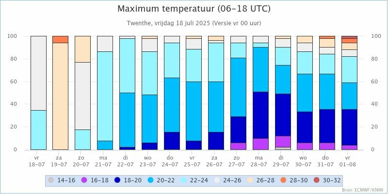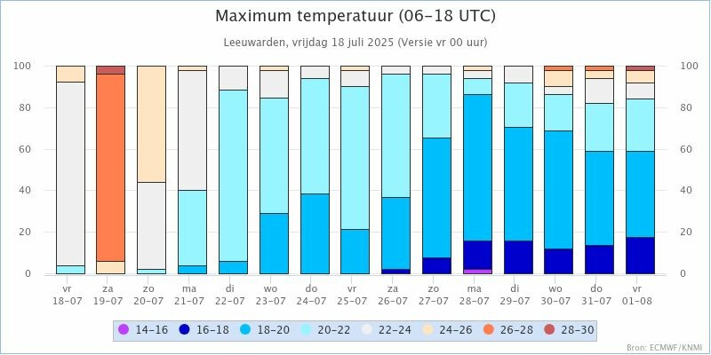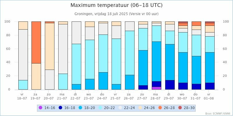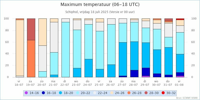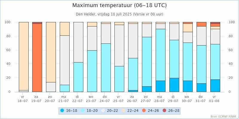 KNMI Kansenstaafdiagram voor de maxima in: De Bilt, Den Helder, Eelde, Leeuwarden, Twenthe, Schiphol, Maastricht en Vlissingen.