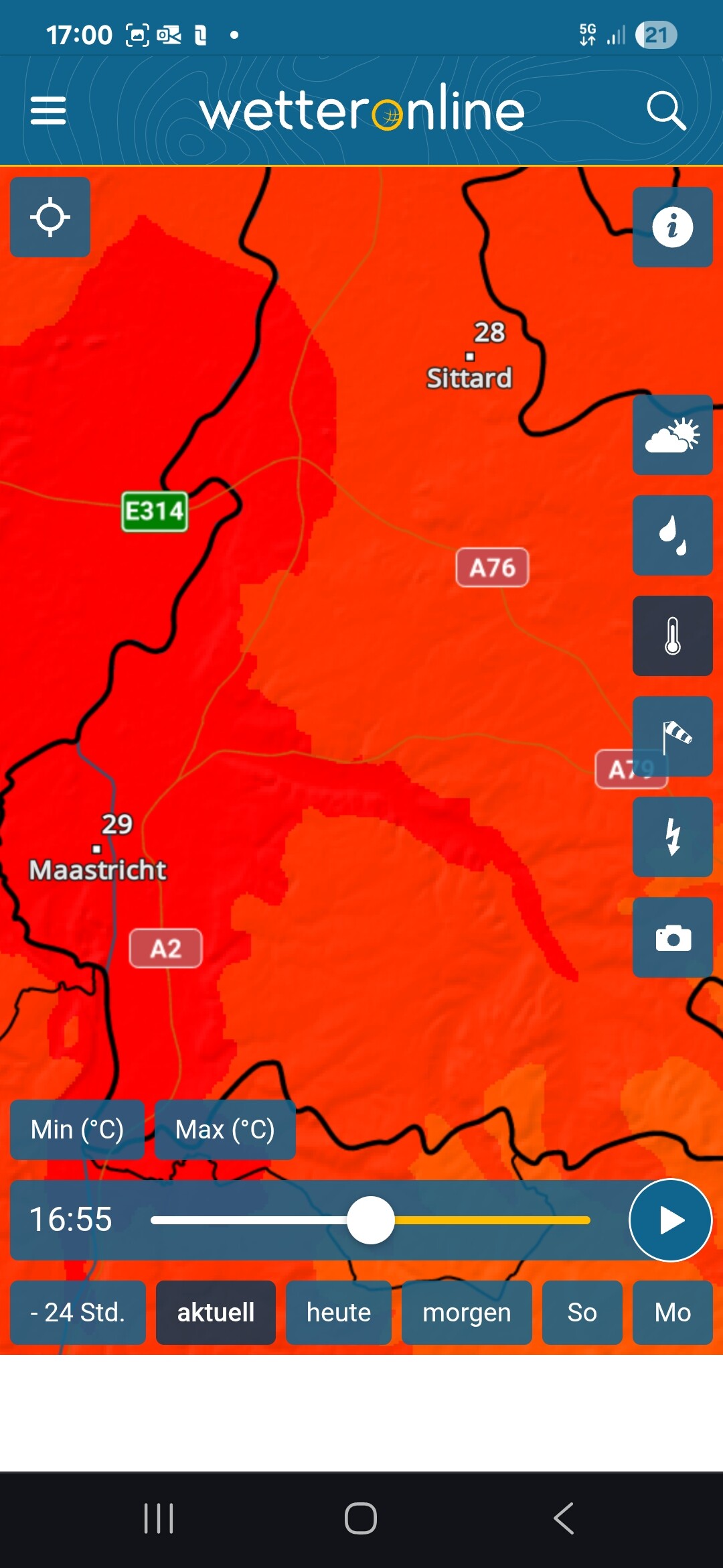 Munstergeleen actueel 28° net iets koeler dan Maastricht die tegen de tropische grens aantikt..Weerbeeld is zonnig met af en toe wat dikkere dan weer dunnere sluierbewolking.
