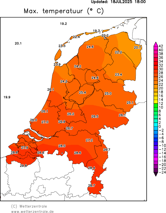 Het noordoosten is behoorlijk achtergebleven met 21 tot 23 graden en weer geen zomerdag