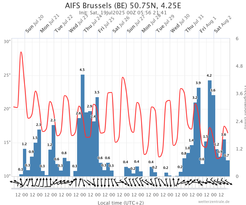 Ook hier blijvend gematigd zomerweer en af en toe regen/buien.
