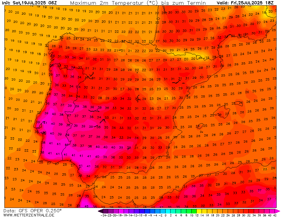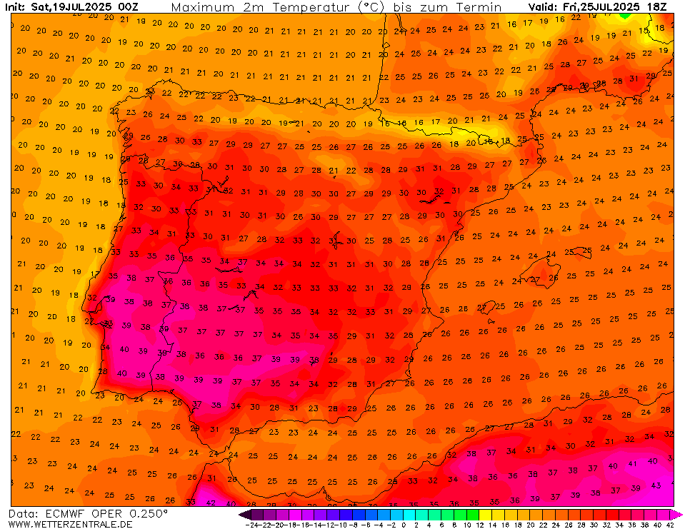 Landinwaarts in het zuiden van Portugal en Spanje komen EC en GFS alsnog met temperaturen richting de 40C voor 25 juli.
