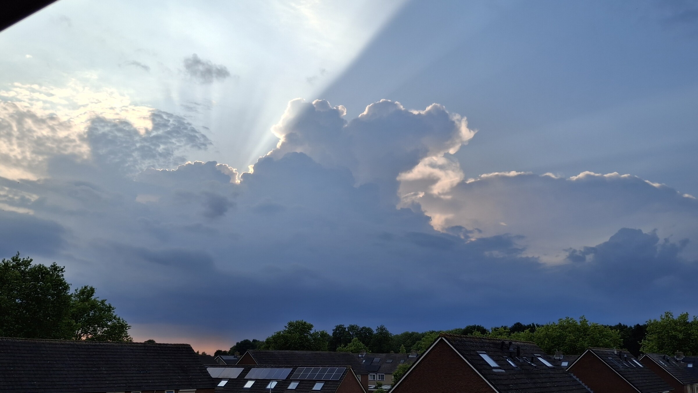 Foto genomen vanuit het dakraam richting het westen. Zat wat onweer op, maar vooral de lichtval en de schaduw van de wolk waren de moeite waard!