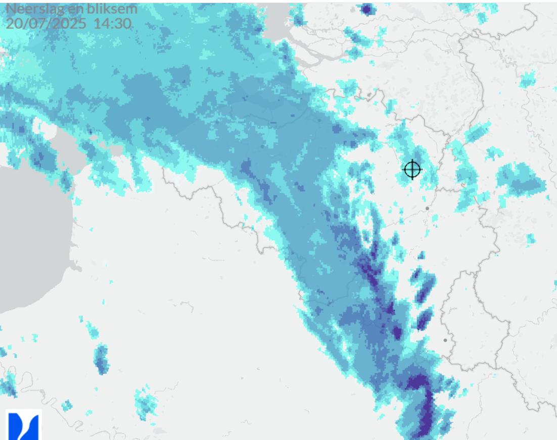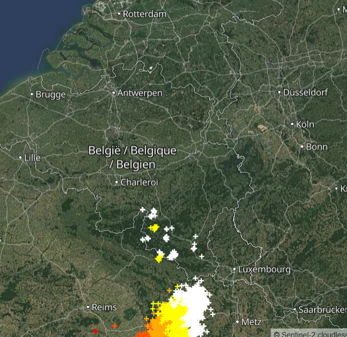 met wat onweer. Echt zware werk zit wat zuidelijker. Mooie bow echo die ook sterk afwijkt naar het oosten, zeer hoge onweersactiviteit. Dat ding zal voor de zuidelijke helft van Luxemburg zijn lijkt het.