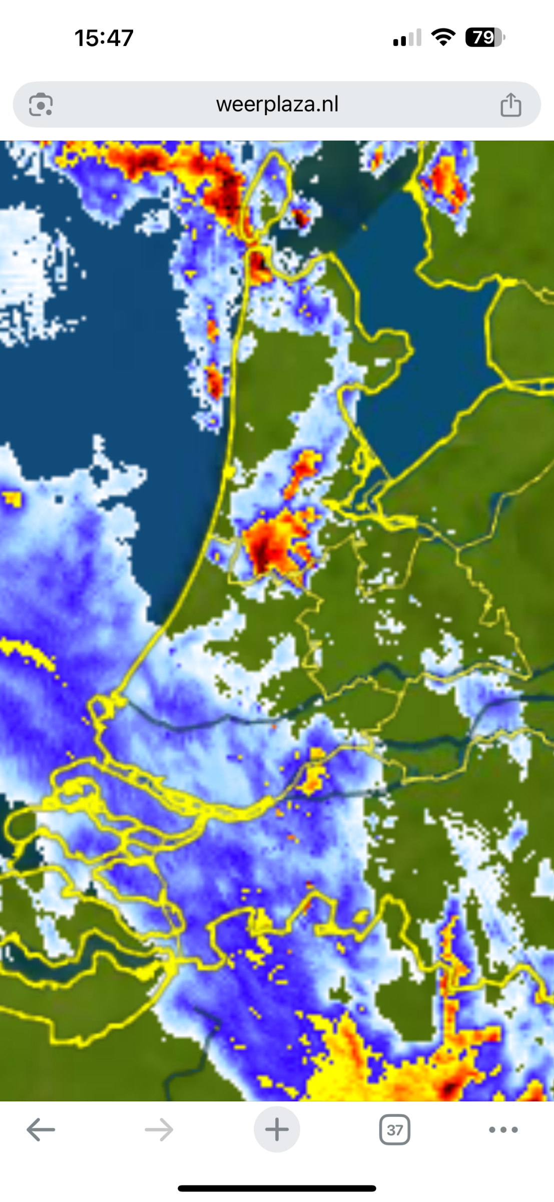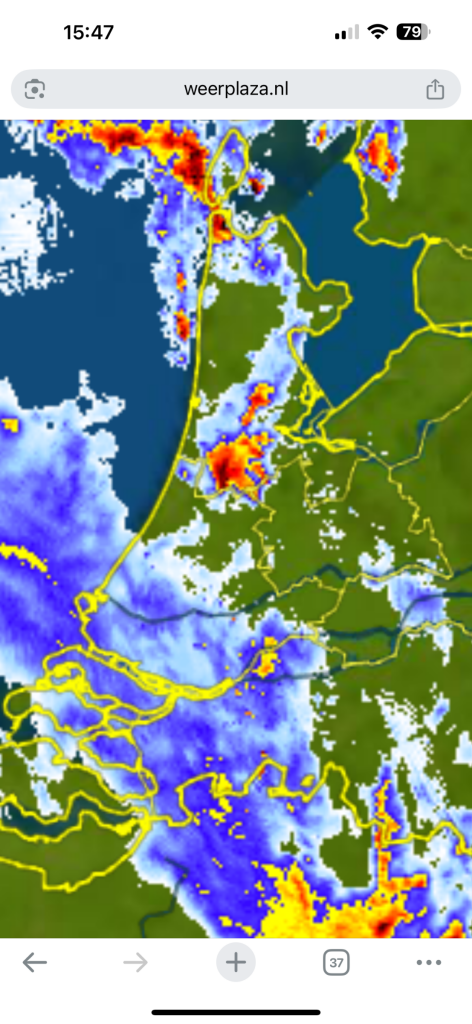 Vooral dankzij een zware bui met wat onweer tussen 14:40 en 15:40. Maandneerslag nu boven het langjarig gemiddelde.