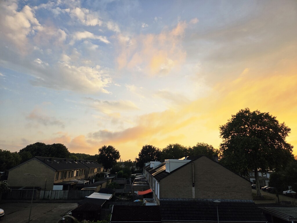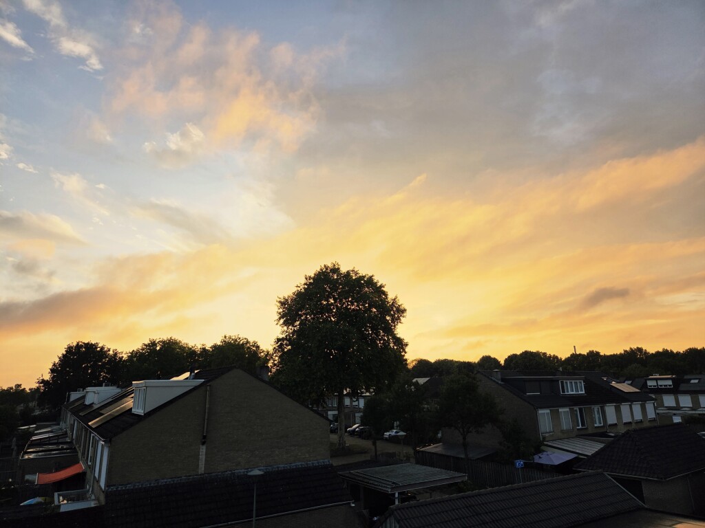 Door stratusflarden die massaal voor de ondergaande zon langstrokken, met daarboven hogere bewolking.