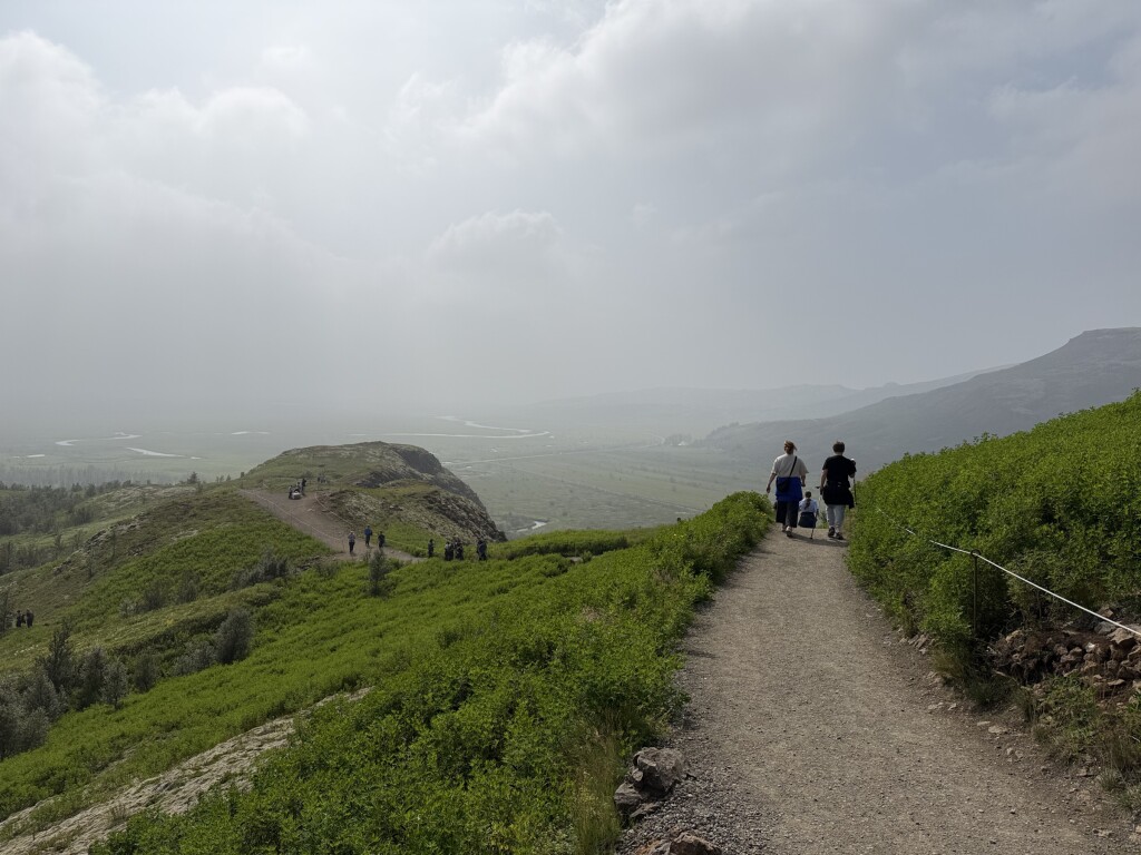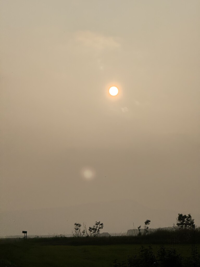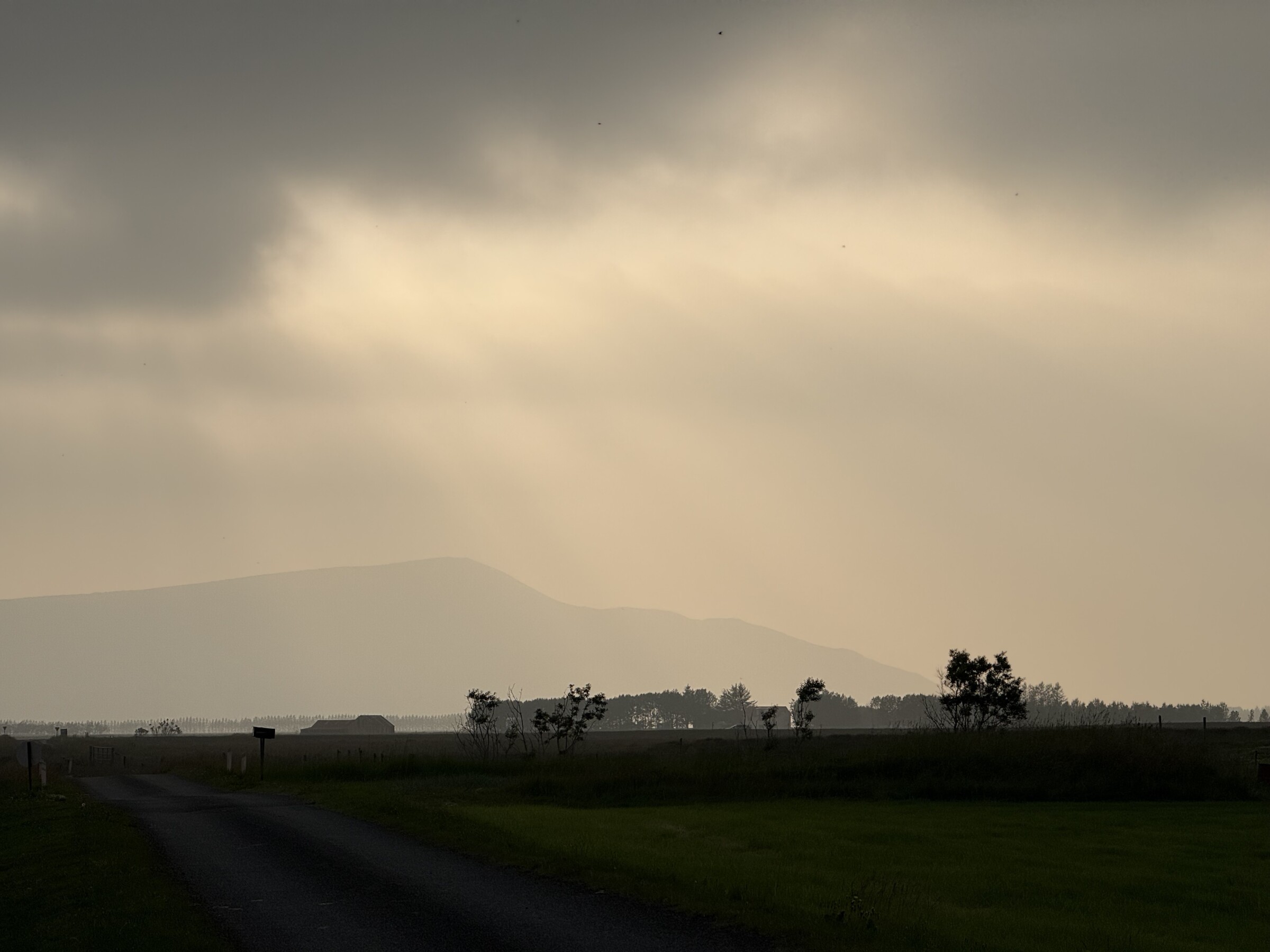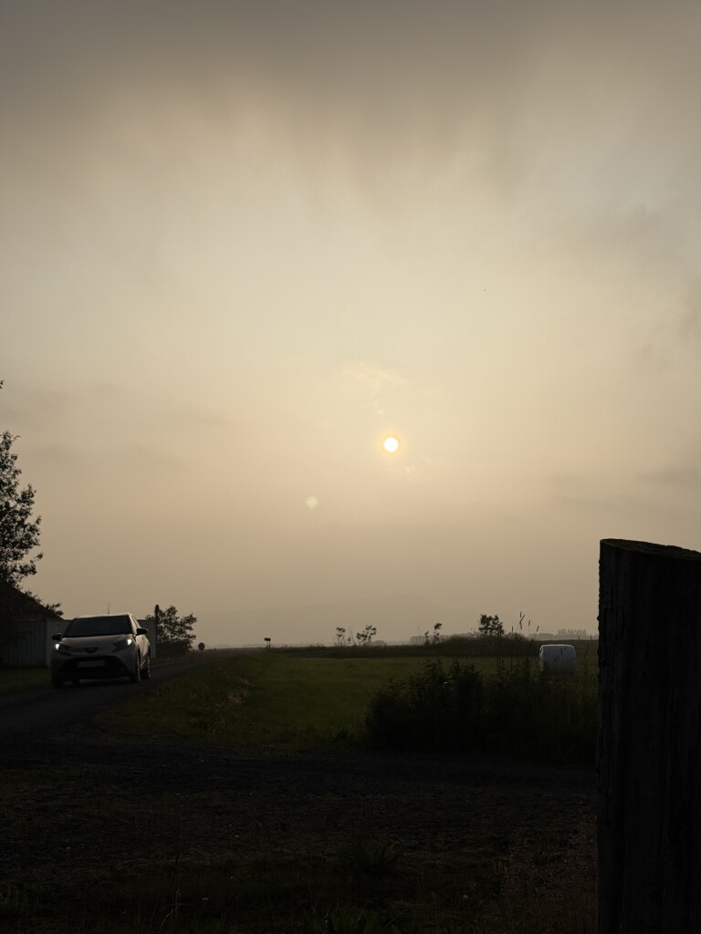 De vulkaanuitbarsting vlakbij Reykjavik veroorzaakt momenteel smog in het zuiden en westen van IJsland. Vanochtend was het flink mistig hier (waarschijnlijk ook versterkt door de aerosolen), maar ook toen de zon doorbrak bleef het heiig. Het zicht is nu, anderhalf uur voor zonsondergang, zelfs maar een paar kilometer. De lucht heeft wel een mooie oranje gloed!