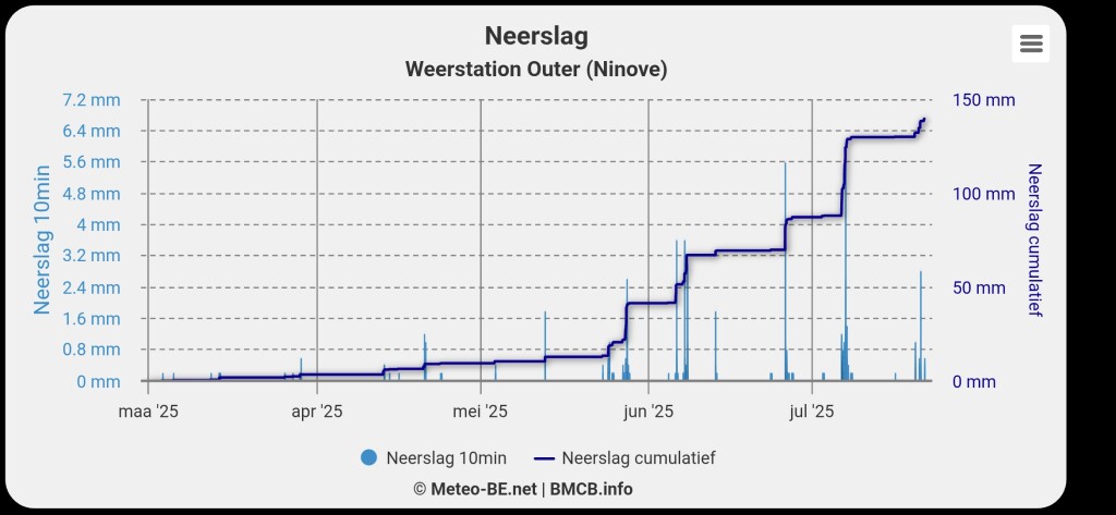 Ik heb even de regenuren opgericht sinds 1 maart in Ninove. Amper iets. Ook de laatste 3 weken amper iets dat het vermelden waard is qua duurtijd. En de temps zijn toch ook allesbehalve een dip?