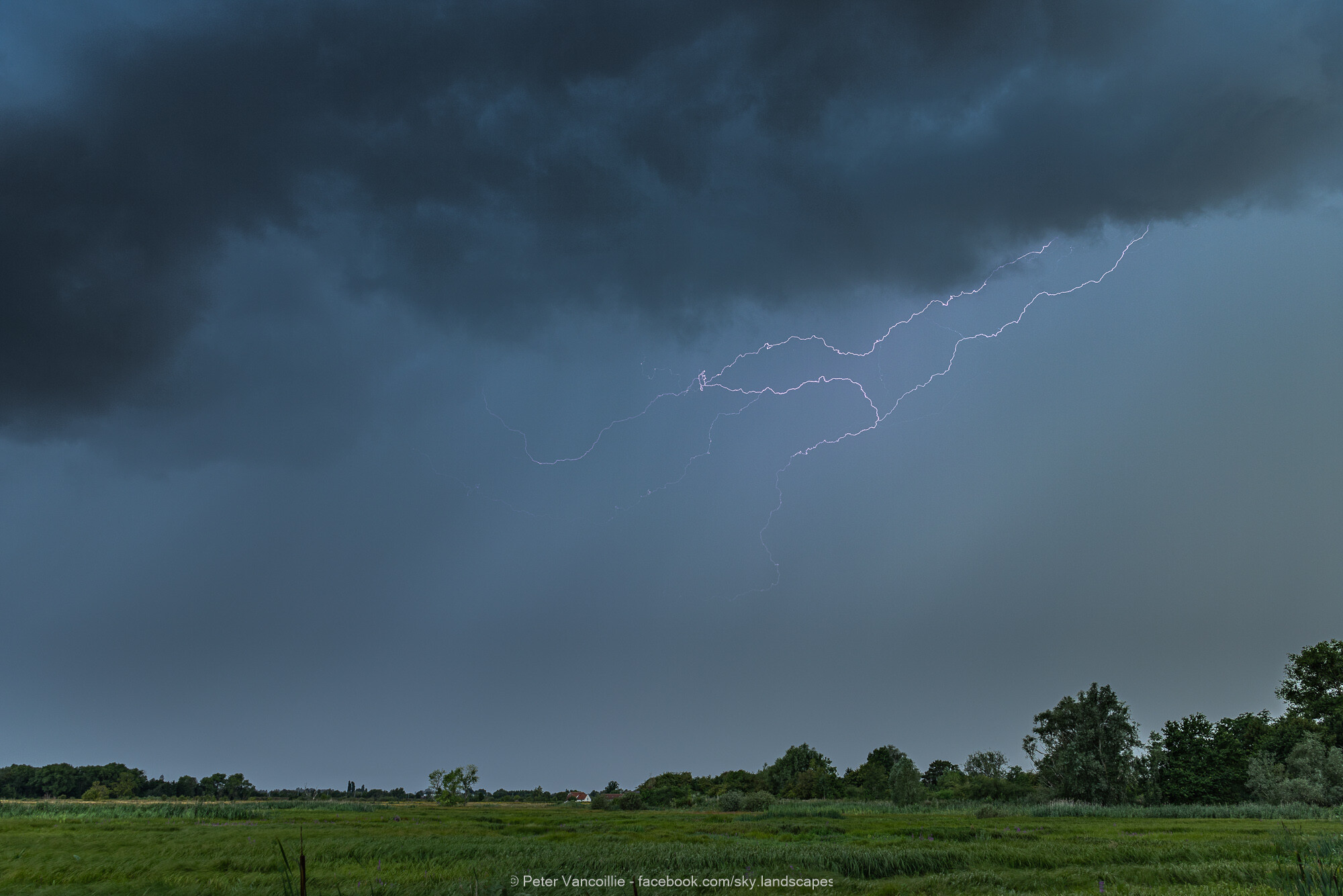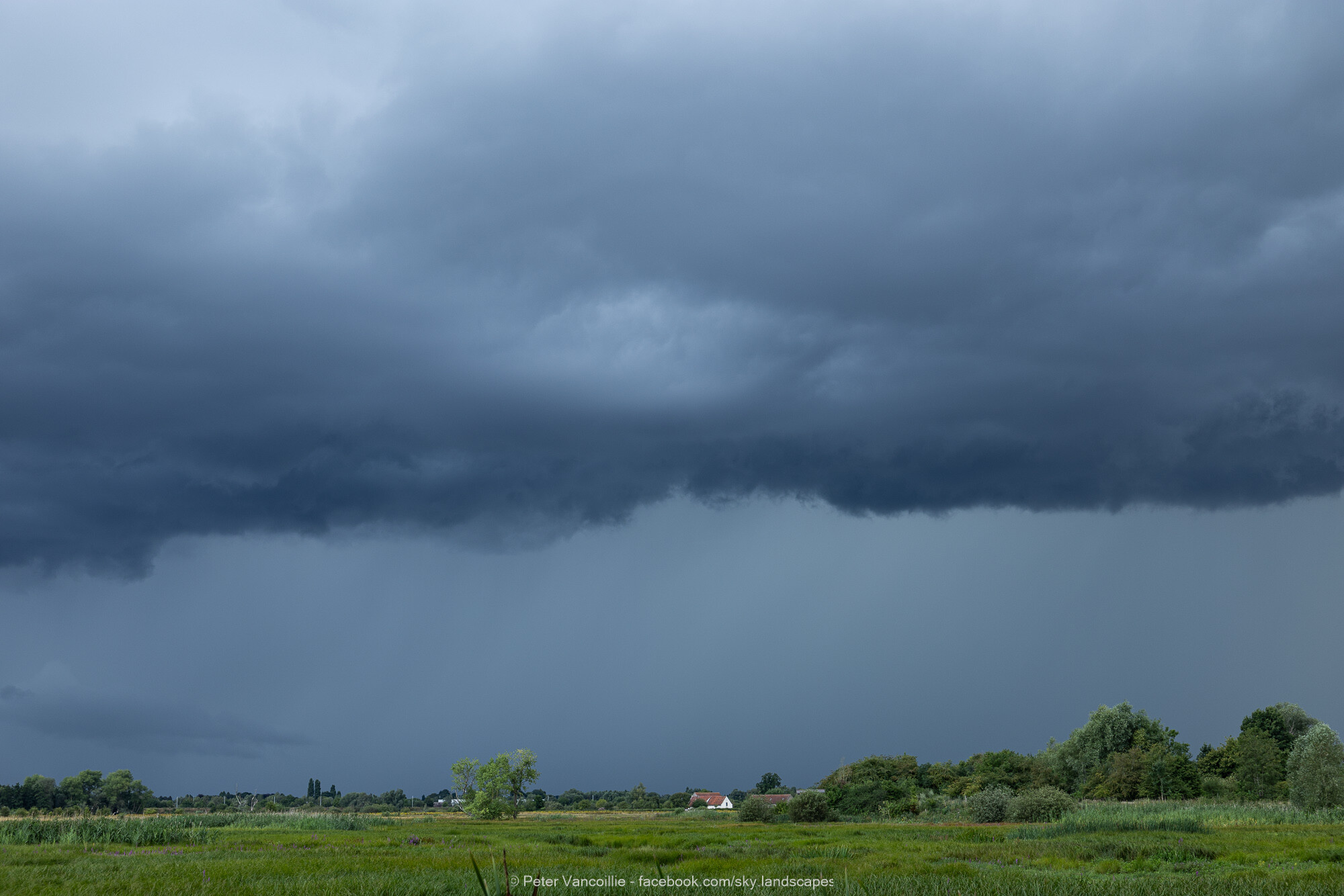 Mooie arcus nadert, nog regelmatig gedonder. Die arcus nadert en groeit, maar bliksem? Ho maar. Dat krijg je niet zomaar omdat je een nieuwe camera hebt om die te vangen. Bij het overtrekken mooie luchten, maar wat geflits, en wat zwakke CC kanaaltjes, meer kon er niet vanaf. Toen de bui bij Beervelde was, ten oosten van hier, kon er wel weer een pak inslagen vanaf. Hier dus niet één