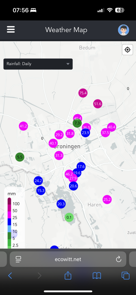 Die 75mm bij Zuidwolde vind ik discutabel gros is in een halfuur gevallen rond 4u vannacht, echter Beijum Oost en Bedum Zuid zitten ook tussen de 50 en 60mm. Het gaat weer van dikhout! Ik zit hier zelf op 6mm. Mooi dit is een toffe bui want zoals Wim al schreef weinig beweging maar wel veel water in de tas.