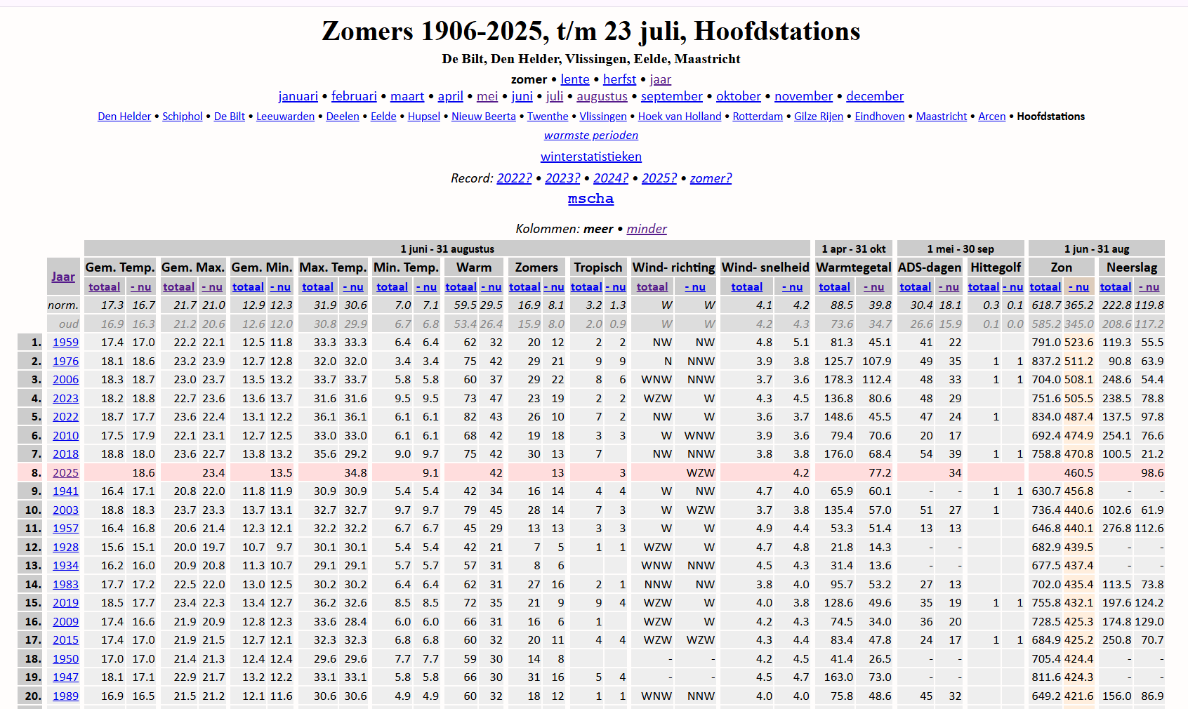 Zou iemand ook eens kunnen kijken naar maximum temperaturen? Het gaat nu steeds over de ''gemiddelde temperatuur'' maar voor de beleving van een grote zomer gelden vooral de maximum temperaturen / zonuren.Gemiddeld over het land tot nu toe een 4e plek voor de gemiddelde maximumtemperatuur en een 8e plek voor het aantal zonuren sinds het begin van de vorige eeuw.