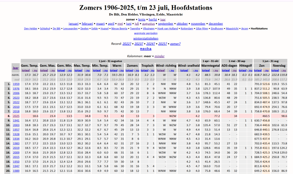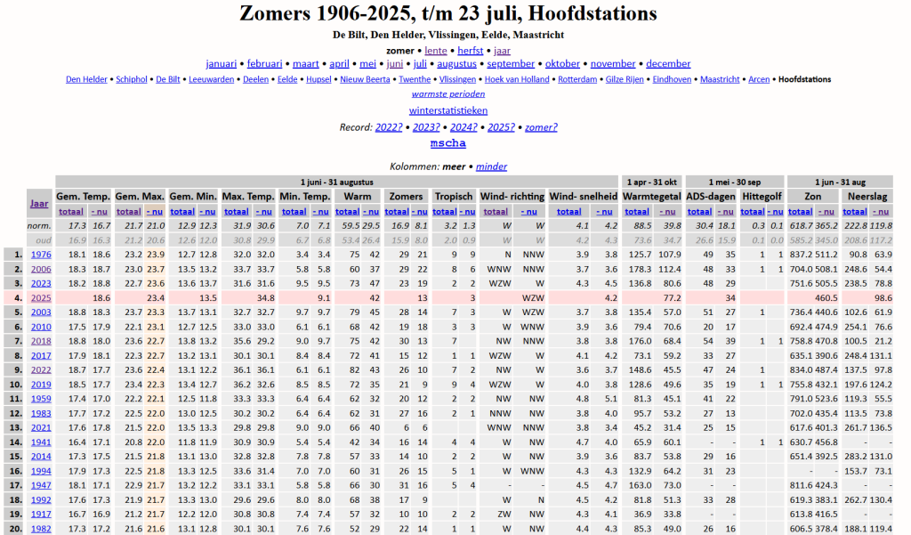 Dit zegt vooral veel over de zomers van het oude klimaat. Maar daar leven we niet meer in. En als we mogen geloven dat het tempo van opwarming zo hoog ligt als ze zeggen (want voortdurende hoge CO2 uitstoot) dan vind ik een vierde plaats helemaal niet zo hoog. En de komende twee weken lijken we niet in de ranglijst te gaan stijgen maar wel dalen. Het meeste zal afhangen van augustus. Indicaties voor flinke opwarming zijn er op LT ook (nog) niet.