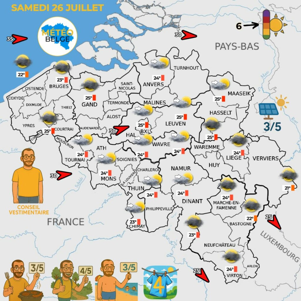 Een vrij aangename zaterdag vóór de terugkeer van onweer op zondagHet weekend begint veelbelovend, met een zaterdag die vaak droog en vrij zonnig verloopt, ondanks enkele wolkenvelden. De temperaturen worden zacht tot lokaal warm (tot 26?°C) bij een matige westenwind. In de namiddag is een lokale bui niet uitgesloten, vooral van Henegouwen tot in het oosten van het land.