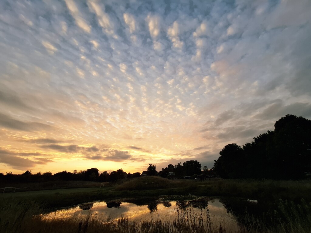 was er er een serene zonsondergang. Fraaie luchten. Maar het tijdstip vandeondergaande zon en de hoeveelheid lucht en kleuren van het licht deden mij opeens beseffen dat de daglengte nu sneller merkbaar korter wordt.