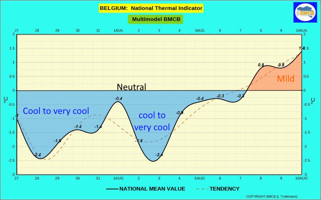 De frisse trend zet zich door: tot en met 6 à 7 augustus blijft de nationale thermische indicator tussen -0,4 en -2,5 onder het klimatologisch gemiddelde. Pas vanaf 8 augustus verwachten we een omslag met positieve afwijkingen tussen +0,8 en +1,5 boven de normale waarden voor het seizoen.