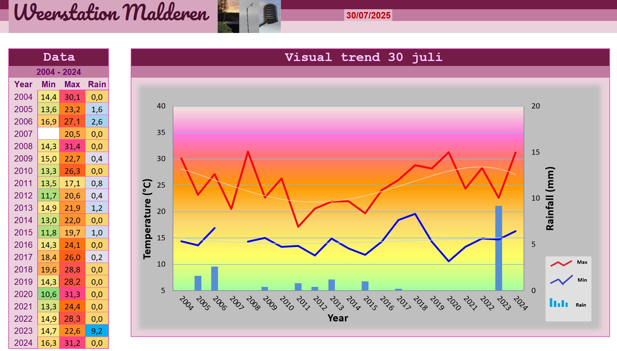 Een bijzonder prachtige en sfeervolle zonsopgang was vanochtend ons deel toen de omgeving met dunne nevelbanken was bedekt en de vuurrode zon gezelschap kreeg van fijne sluierwolkjes. Hierbij heerste een aangename koelte doordat de temperatuur afgelopen nacht kon dalen naar 14,3 graden. Het zag er allemaal heel rustig en vredig uit, ware het niet dat er in het noorden dreigende silhouetten van forse stapelwolken te zien waren. Deze zouden later voor een paar flinke buien zorgen voorbij de Nederlandse grens, maar in Malderen (en Brussel) werd het op-en-top zomerweer waarbij we overdag aankeken tegen wat verspreide stapelwolkjes en een weinig sluierbewolking. De temperatuur steeg snel richting 31,4 graden terwijl er een noordoostelijk briesje met snelheden tot 31,4 km/h opstak. Later in de namiddag kwamen er ook wat stapelwolkjes tevoorschijn en Cirrus/Cirrostratusbewolking die de passage van een warmtefront markeerden waarachter zeer hete, tropische luchtmassa's klaarlagen om Malderen morgen levend te roosteren. De stapelwolkjes verdwenen 's avonds weer, maar de Cirrusbewolking bleef om voor een mooie zonsondergang te kunnen zorgen. Als voorsmaakje op wat komen gaat, bleef het tot diep in de nacht aangenaam warm. De dag eindigt met een neerslagtotaal van 0,0 mm.