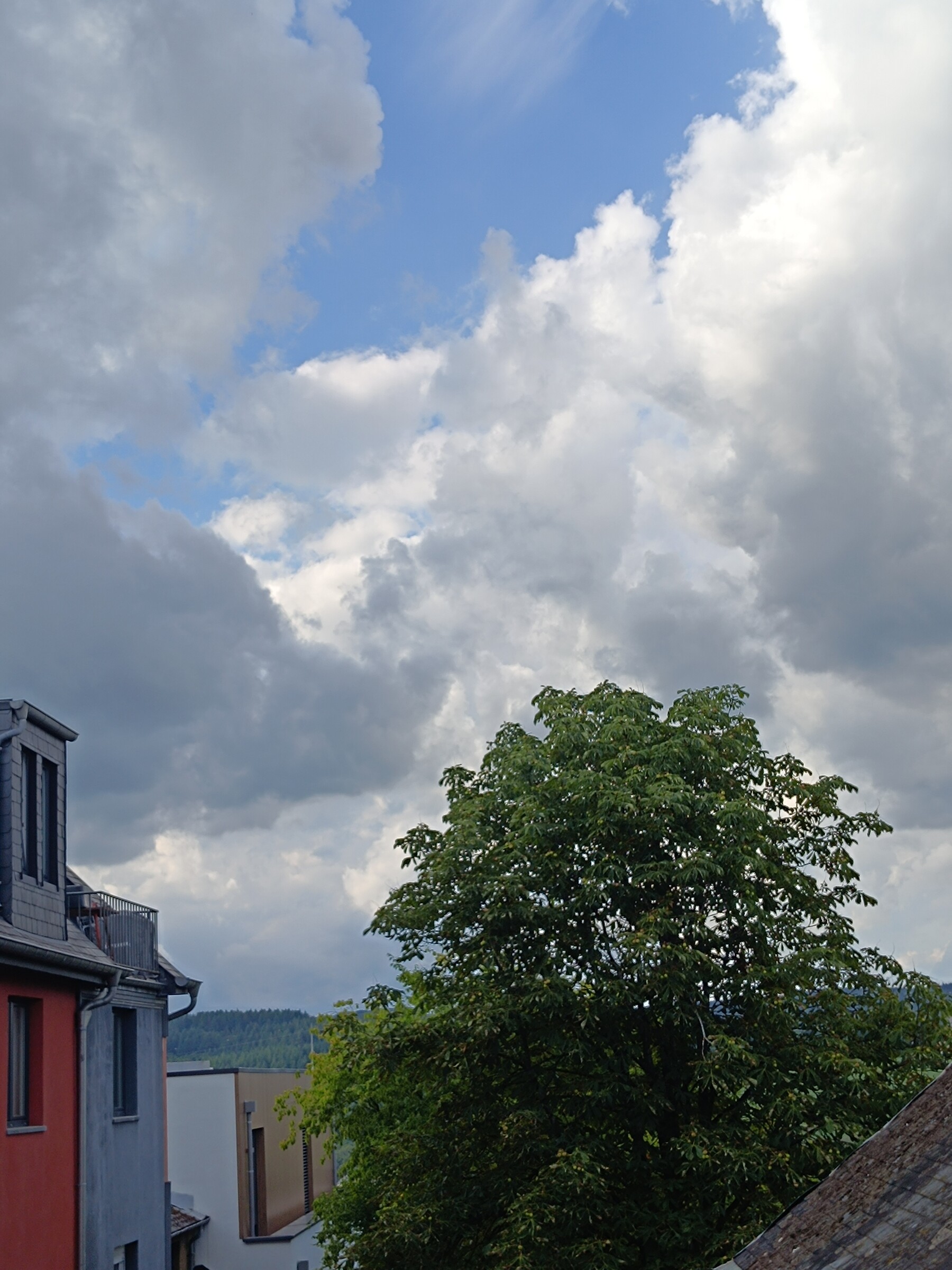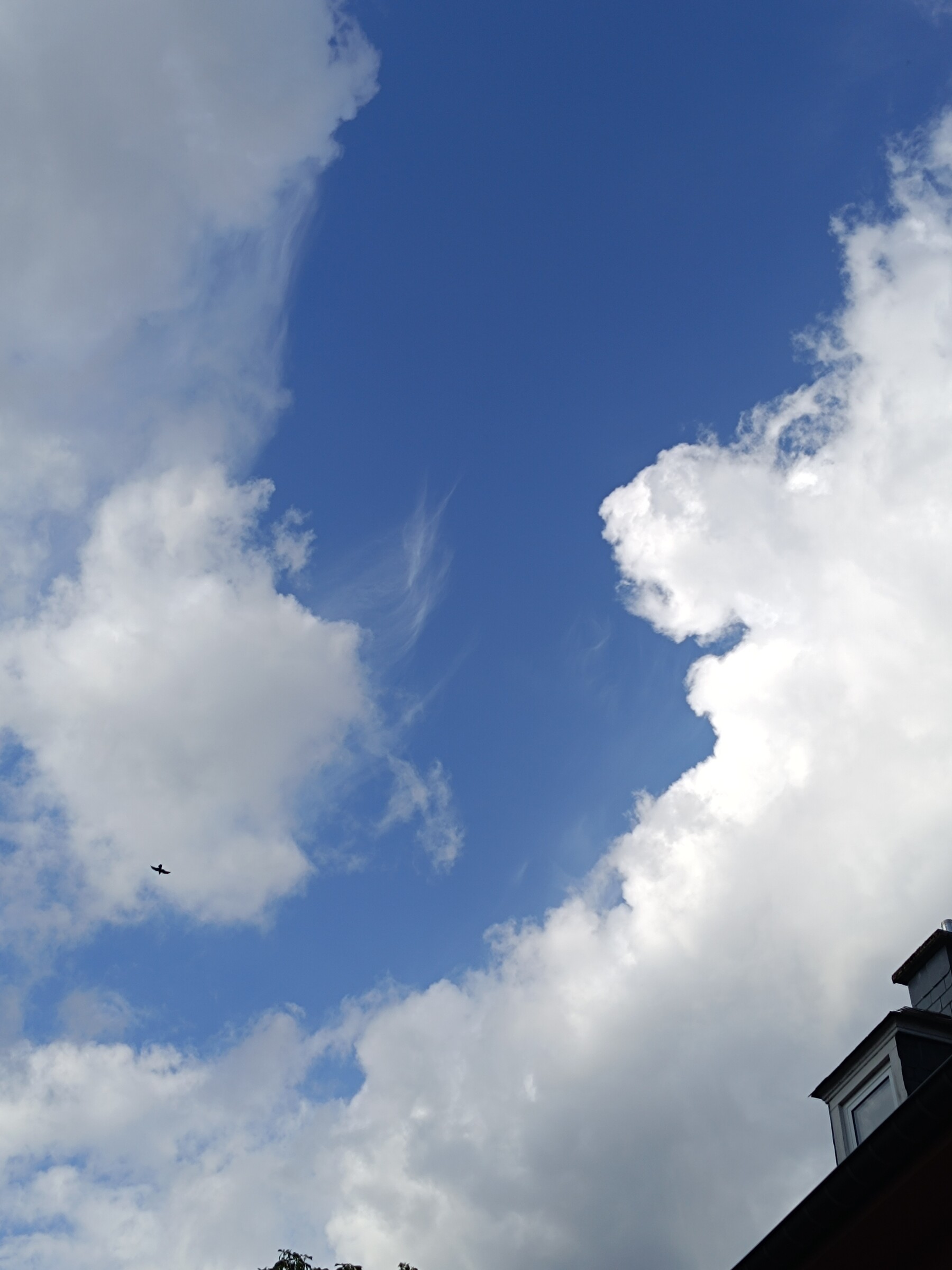 Vandaag heb ik een 'binnenblijfdag', dus een foto vanuit het zolderraam, en een vanaf de straat. Op die tweede foto staat ook een vogel, waarschijnlijk een kauwtje, want die zitten hier tientallen.