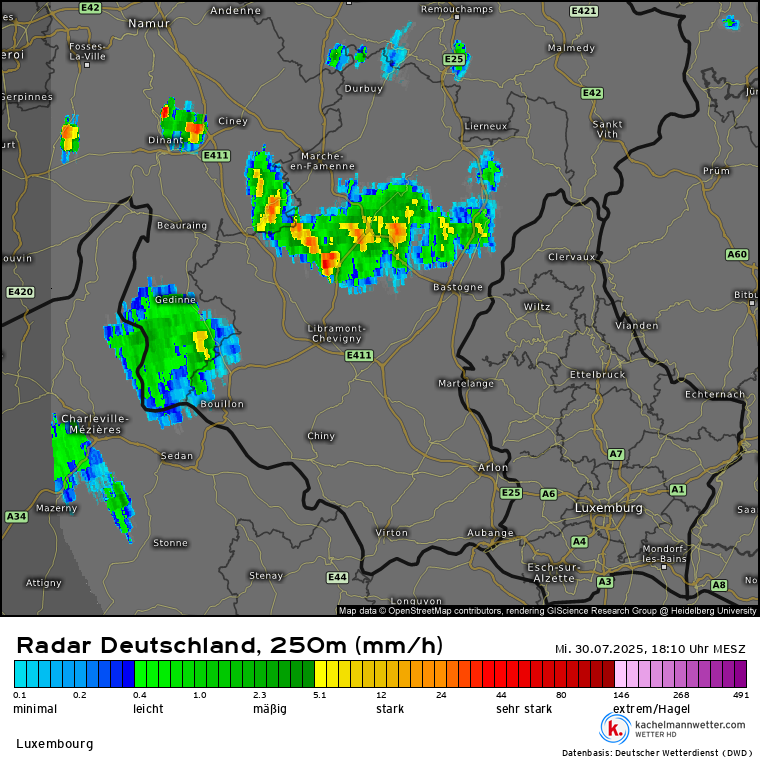 De naderende bui ziet er op de radar niet echt spectaculair uit (derde afbeelding).
