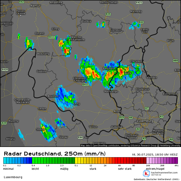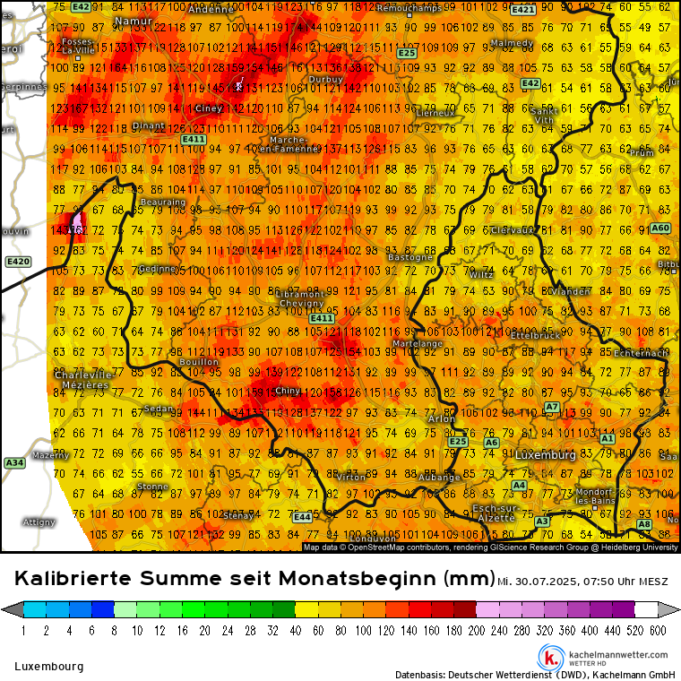 Terwijl het nu bijna overal in de Benelux droog is, komt het er hier toch even flink uit. Qua neerslag eindigt juli hier ongeveer normaal; in Belgisch Luxemburg echter boven normaal. Het was hier vandaag toch nog ruim 21°C.