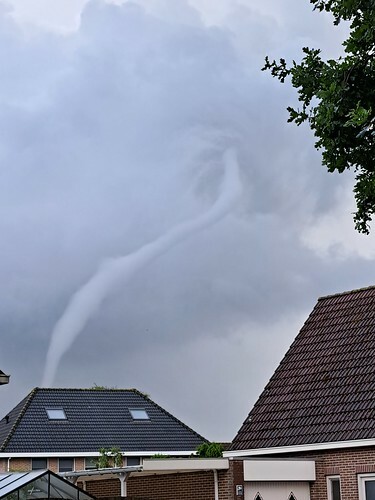 Een windhoos die vanmorgen vanaf de Schelde door de tuin ging, en over het huis van de buren met veel kapotte dakpannen tot gevolg.