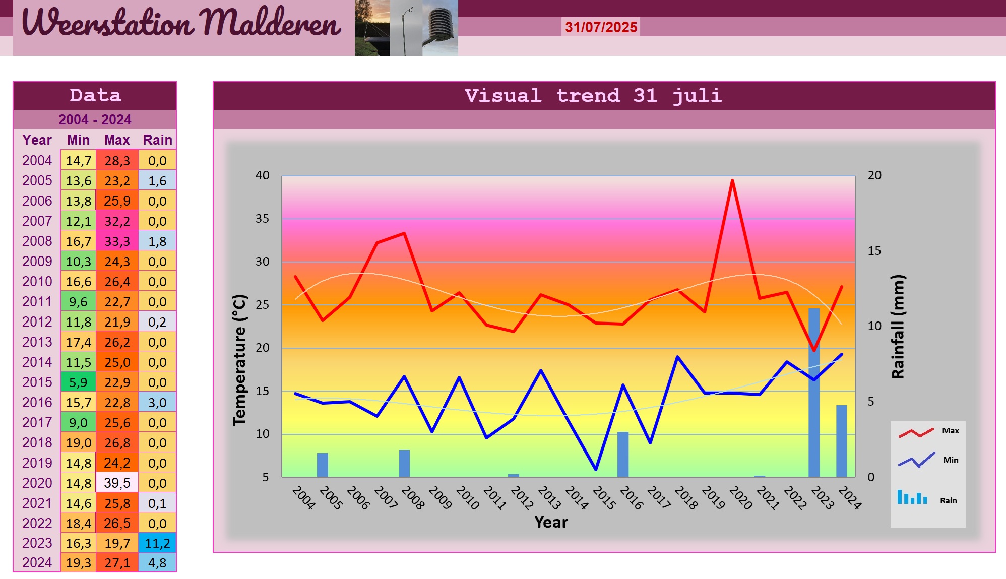 Vanochtend was het reeds erg zacht met minima van 16,7 graden en een uitgestrekte, quasi wolkeloze lucht. Overdag schoot het kwik pijlsnel de hoogte in, en werd de tropische grens van 30 graden in een mum van tijd overschreden. Naar de middag toe verscheen er wat Cirrusbewolking terwijl deze in de namiddag wat gezelschap kreeg van Altocumulusveldjes die de zon af en toe afzwakten. Veel haalde dit niet uit want de temperatuur kwam alsnog op een zinderende 33,3 graden terecht. Uitgestrekte en aaneengesloten Altocumulusvelden maakten in de vroege avond hun opwachting terwijl aan de voorzijde van de wolkenvelden flinke stapelwolken werden gevormd. Hieruit ontwikkelden zich echter nog geen buien. Achter de Altocumuluswolken verschenen terug wat opklaringen, maar ook hierin ontwikkelden zich flinke stapelwolken die op hun beurt evenmin voor buien zorgden. Wat volgde waren geleidelijk dikker wordende wolkenvelden samen met Stratocumulus, Cirrostratus, Cirrus densus en Cumulus congestus. Dit kregen we voor een groot deel van de avond te zien, maar het was wachten tot rond 23H toen de eerste onweersbuien vanuit het zuidwesten kwamen binnengespoeld, begeleid door rukwinden tot 29,0 km/h uit het zuid- zuidwesten. Het onweer leverde aardig wat bliksem op al leek het geheel ten westen van ons voorbij te trekken. Later begon het ook in het oosten te bliksemen zodat het nu langs daar leek weg te trekken, maar toen een oorverdovende inslag vlakbij werd gevolgd door felle regen werd meteen duidelijk dat het gewoonweg b ven Malderen hing. Na het onweer volgde een periode met wat lichtere regen terwijl het enkel in de verte nog wat bliksemde. Vervolgens werd het rustig en droog waarmee dit etmaal ook ten einde gaat. De radar toont echter nieuwe onweerscellen die onze kant opkomen dus lang gaat die rust niet duren. Voorlopig bedraagt het neerslagtotaal 1,8 mm.